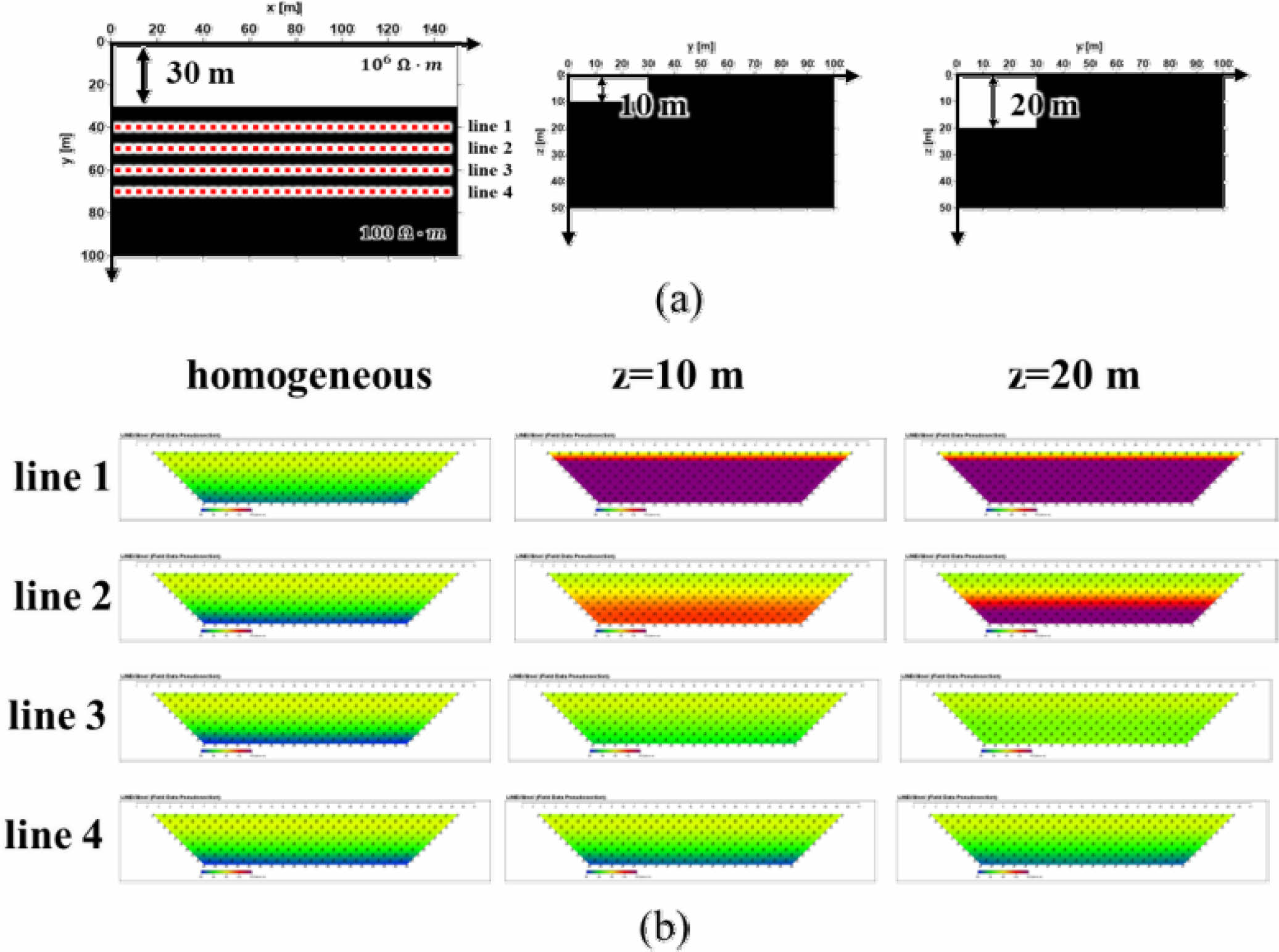 Fig. 10 Resistivity simulation to evaluate air affection (a) with depth of 10 m and 20 m; (b) results from each model. |