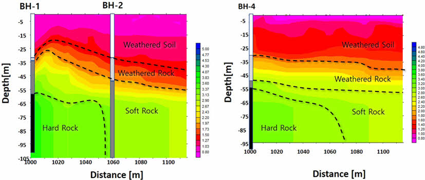 전기비저항 자료를 시추 주상도와 복합하여 해석하면 심부는 비교적 깊게 존재하지만 100 Ω-m의 낮은 비저항은 파쇄대의 영향으로 평가된다. 연암층도 300 ~ 500 Ω-m로 낮게 나타나 절리나 파쇄대가 분포한다는 것을 알 수 있다. BH-1과 2를 지나는 R-1에서 두 시추공 사이는 저비저항으로 나타나지만 주상도 결과에서도 풍화암으로 해석된 BH-2의 우측으로 심도 35 m 부근에서 고비저항이 나타나기 때문에 풍화대가 분포하는 것으로 추정할 수 있다. R-3에서 측선의 좌측보다 우측에서 상대적으로 저비저항이 나타나는데 주상도에서 BH-3의 연암층이 BH-4보다 두껍게 나타나는 것으로 보아 연암층의 영향인 것으로 해석될 수 있다.