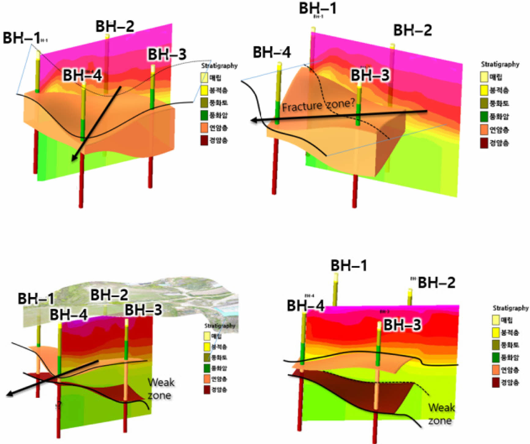 탄성파 자료와 주상도 자료를 복합적으로 해석하면(Fig. 13) BH-2에서 BH-4를 향하는 방향으로 풍화암과 연암이 깊은 구조이다. 또한 BH-1은 풍화암이 상대적으로 적게 분포하고 연암이 바로 나타나는 구조를 임을 알 수 있다. BH-1과 BH-3은 풍화암-연암이 깊게 분포하나 BH-4에서 경암은 비교적 천부에 위치한다. BH-2 방향으로 갈수록 저속도를 보이다 사라지므로 암반 내 파쇄영역이 심할 것으로 예상된다. 저속도층을 이용하여 경암이 BH-2 방향으로 깊어지는 형태를 보이기 때문에 부지 내 구조대는 북동-남서방향으로 존재할 것으로 해석된다.