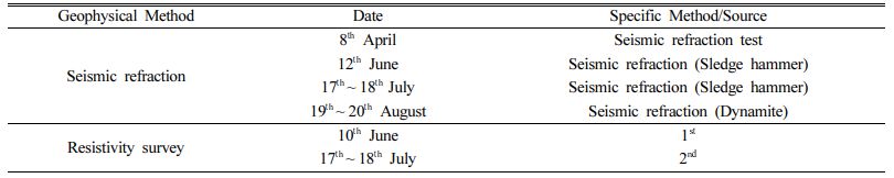 2019년에 해머와 다이너마이트를 송신원으로 이용한 굴절법 탐사와 전기비저항 탐사를 수행하였다(Table 1). 2020년 4월 8일과 6월에 해머를 이용한 기본적인 탐사를 수행하여 적합한 수신기 간격에 대해 분석한 뒤, 이 수신 간격에 기초하여 7월과 8월에 다이너마이트를 이용한 탐사를 수행하였다. 전기비저항 탐사는 2020년 6월과 7월에 2번에 걸쳐 수행하였다.