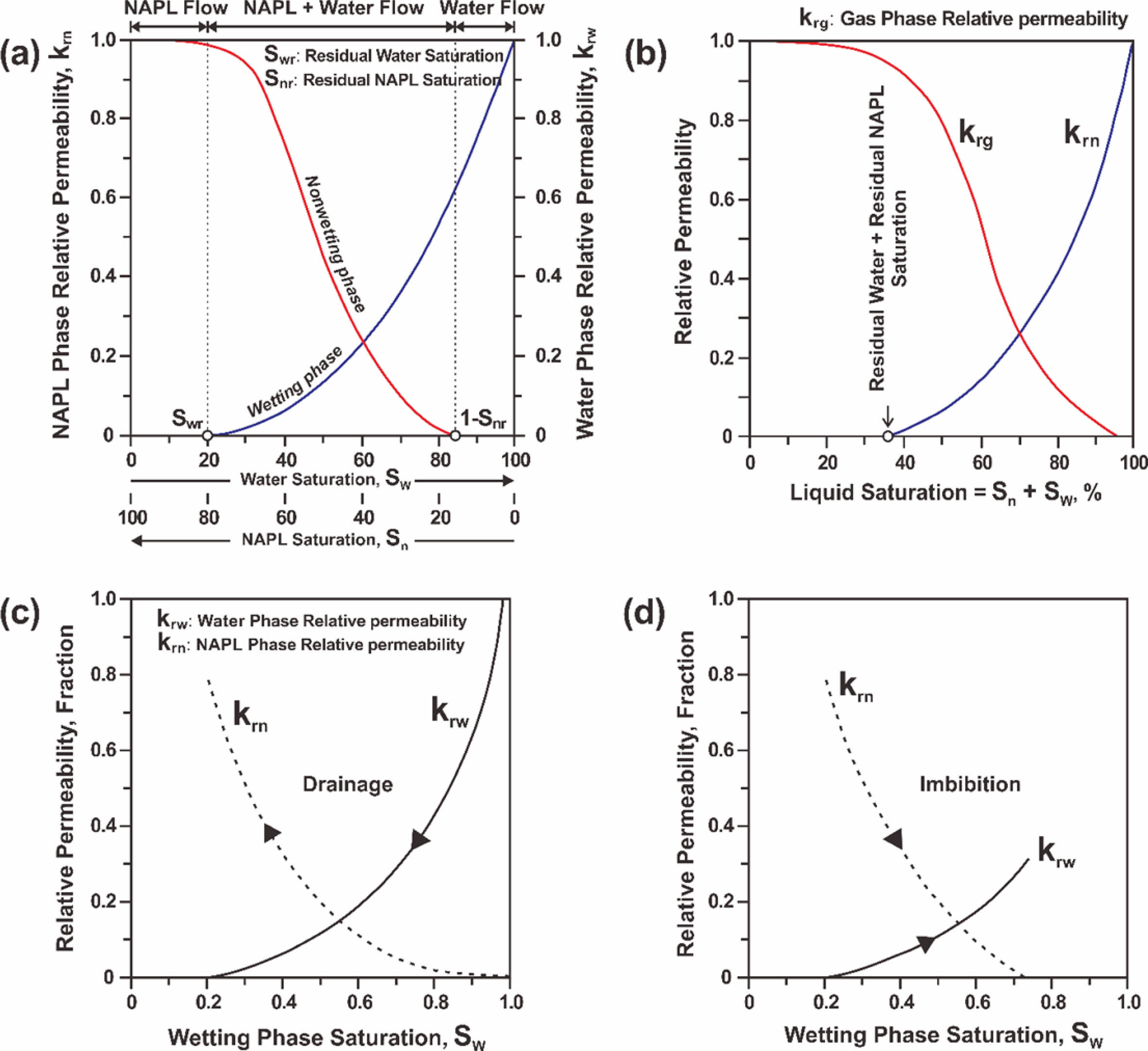 Fig. 1 Typical relative permeability curves of (a) aqueous (water)-NAPL and (b) NAPL-gas phase system, and of (c) drainage and (d) imbibition process adapted from the figures in Ahmed (2018). |