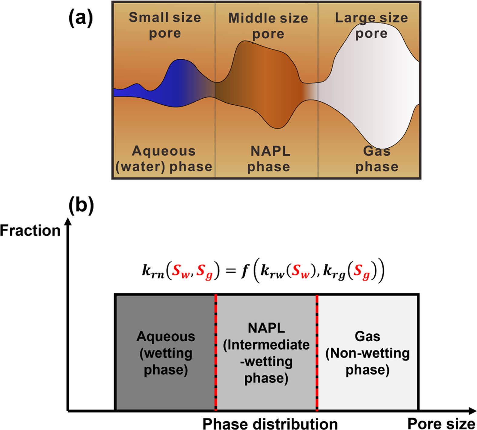 Fig. 2 Conceptual descriptions for (a) hypothetical occupancy of three-phase fluids in the porous media and (b) relative permeability function model of NAPL phase adapted from the figures in Van Dijke et al. (2001). |
