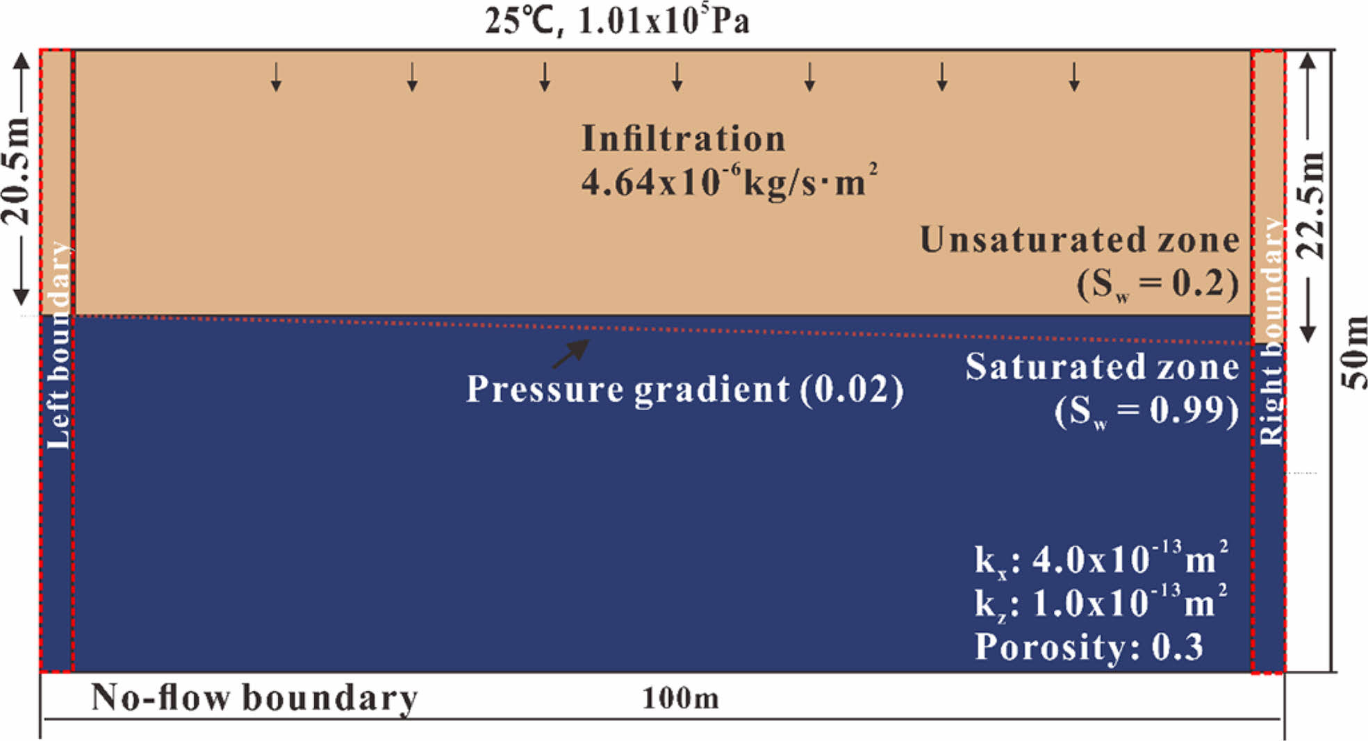 유체의 질량 및 에너지 방정식 계산을 위한 모델의 수리지질학적 조건을 설정하였다. 수평방향과 수직방향 투수율 kx, kz은 각각 4.0 × 10-13 m2과 1.0 × 10-13 m2의 값을 부여하였다. 매질의 공극률 q는 0.3의 값을 균등하게 지정하였으며, 밀도, rs,는 2,600 kg/m3, 열 전도도, C,는 3,100 J/kg로 각각 지정하였다. 또한, 지하수면 상부의 불포화대 및 하부의 포화대의 초기 수분 포화도, Siw를 0.2와 0.99로 각각 설정하였다. 마지막으로, 경계 조건과 초기 조건의 설정 이후 총 8년 간의 시뮬레이션 과정을 수립하여 5년 간 NAPLs이 누출된 후 3년 간 자연적으로 재분포하는 과정을 수치 모사하였다.