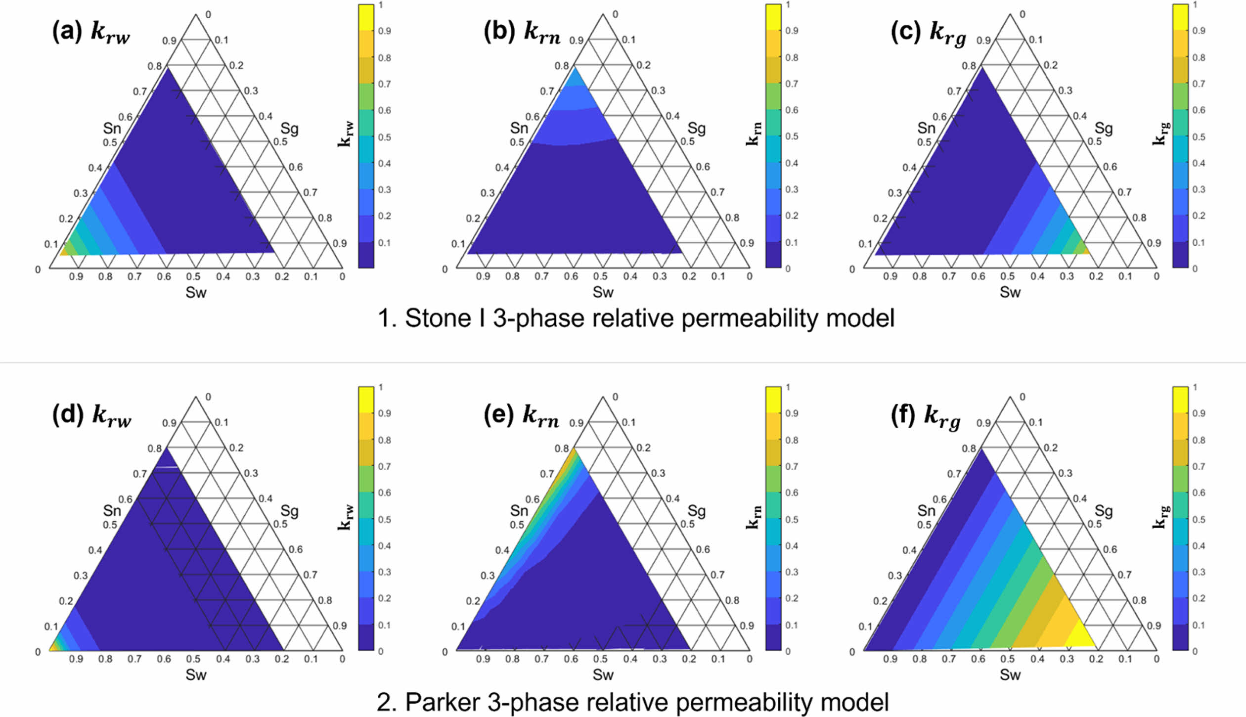 Fig. 4 . (a)-(c) Ternary diagrams of Stone I relative permeability function model for water (krw), NAPL (krn), and gas (krg) phase, and (d)-(f) of the Parker relative permeability function model. |