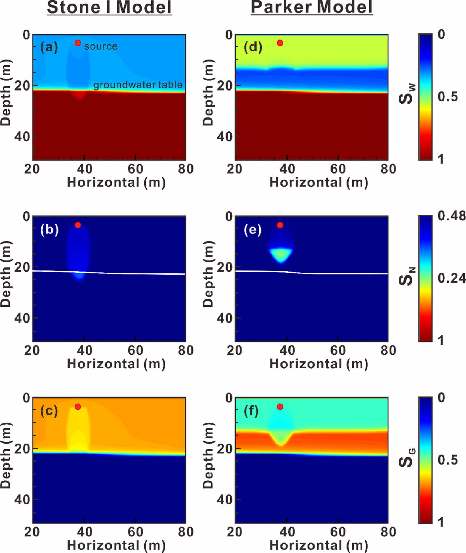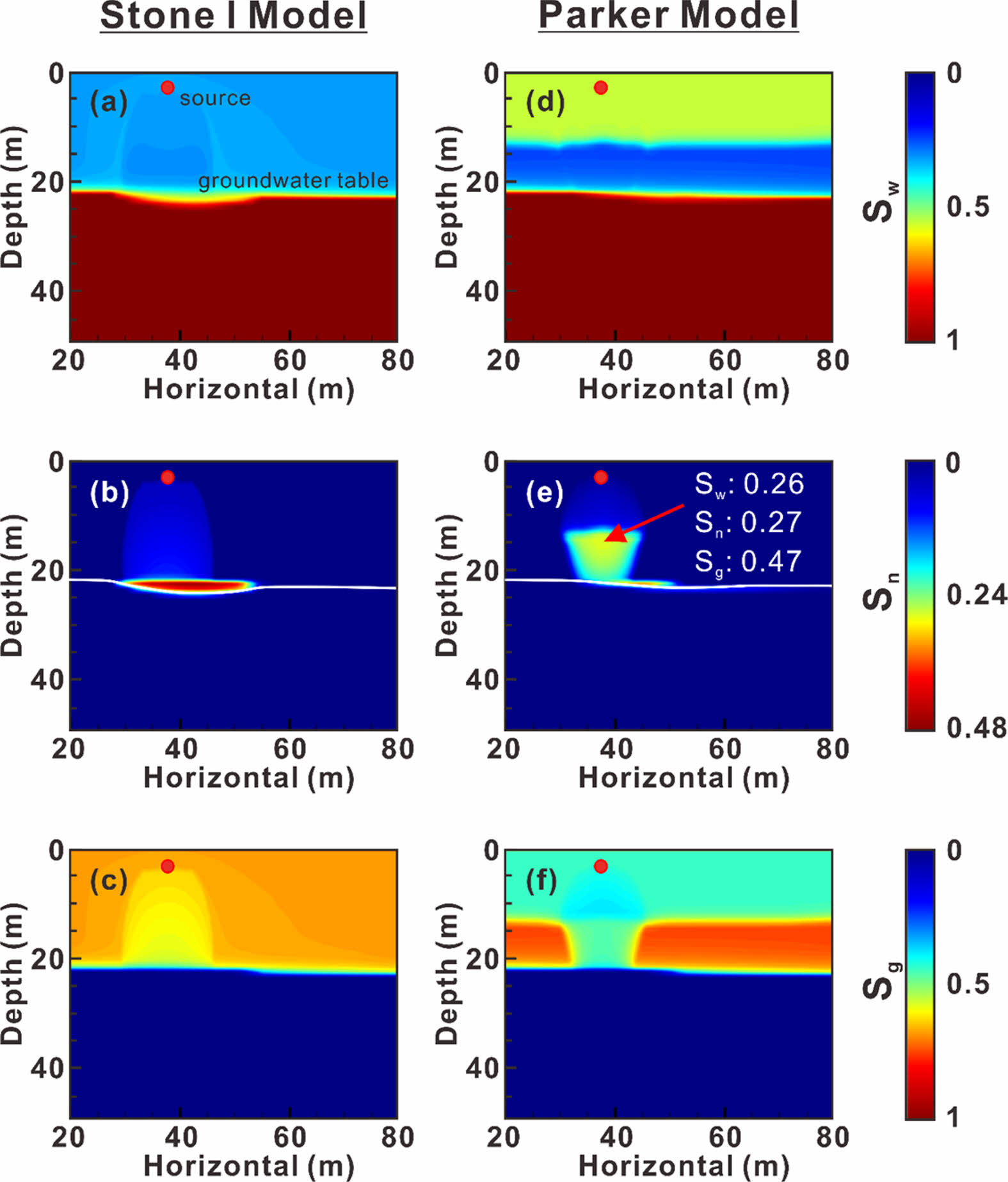 Stone I 함수와 Parker 함수를 적용한 수치 모델에서, LNAPLs이 지중 환경 내로 확산 및 분포 후, 각 유체 별 포화도를 계산한 결과를 도시하였다(Fig. 5). LNAPL은 빨간색으로 표시된 점오염원에서 5년동안 누출되었으며 누출 종료 후 3년동안의 재확산 및 재분포가 이루어졌다. Fig. 5a, 5b, 5c에서는 Stone I 함수를 적용한 수치 모델의 수용 상 유체의 포화도, NAPL 포화도, 기체 상 포화도를 도시하였으며, Fig. 5d, 5e, 5f에서는 Parker 함수를 적용한 수치 모델의 각 상별 포화도 분포 결과를 도시하였다.