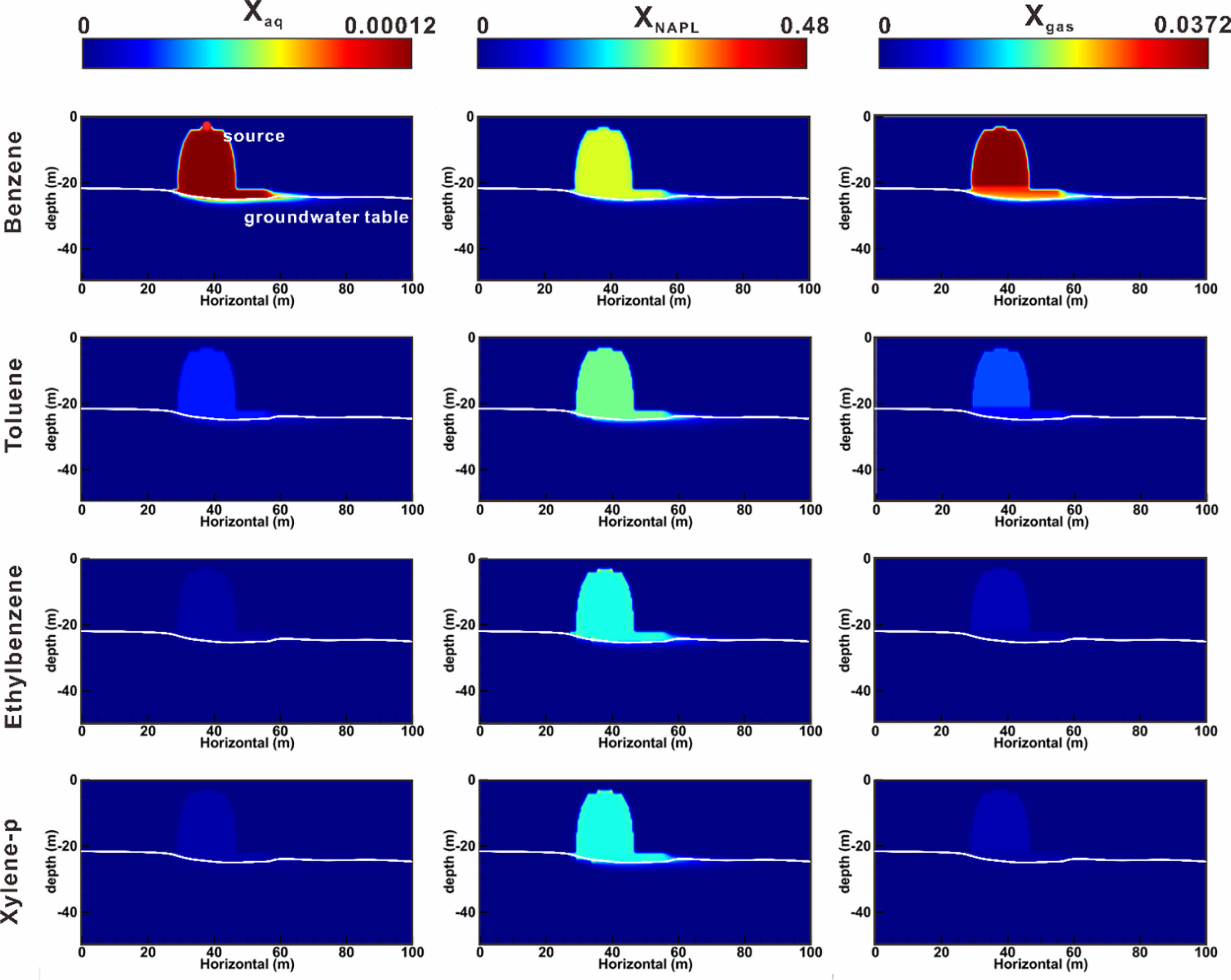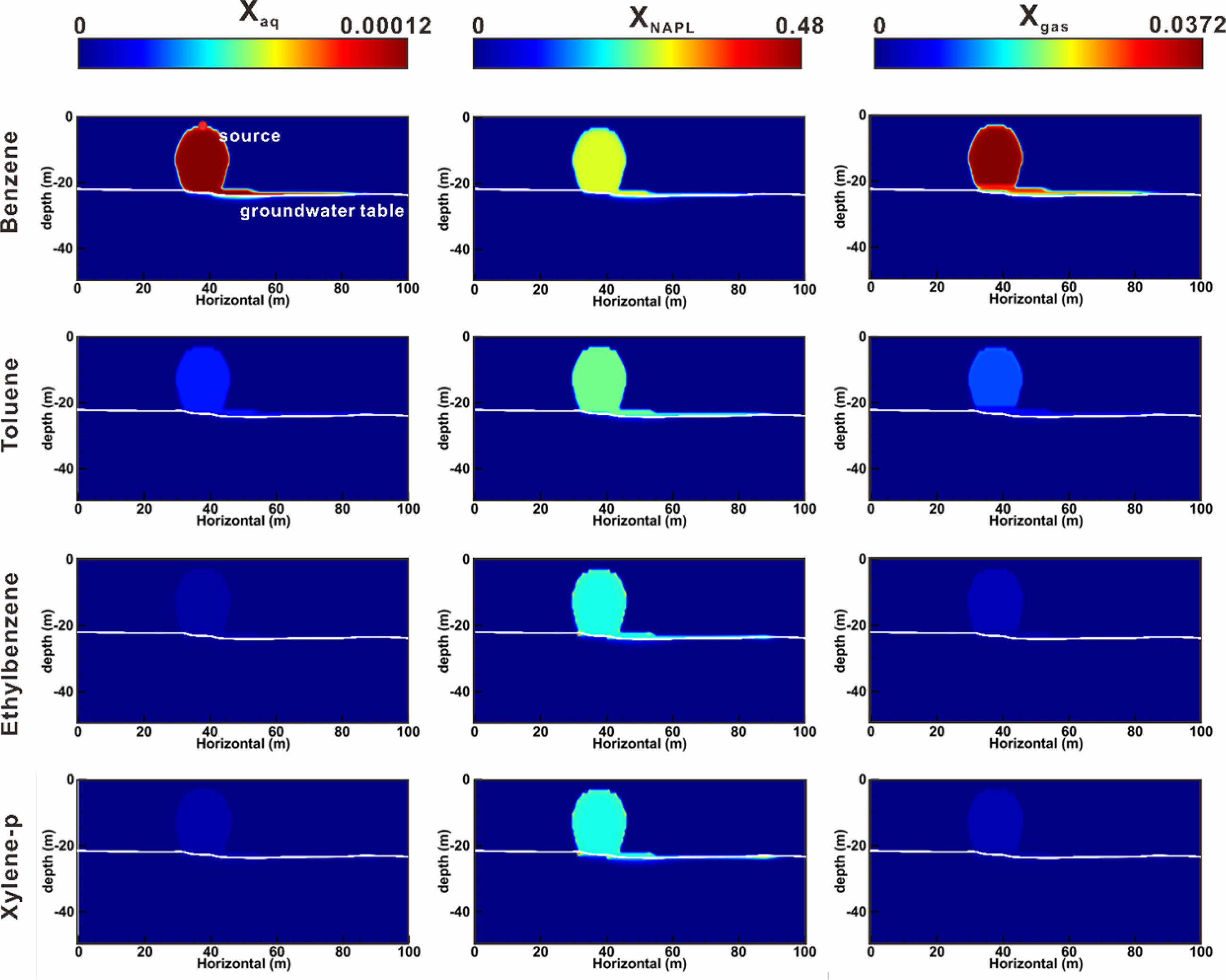 LNAPLs 및 DNAPLs의 불포화대 및 포화대 거동 예측과 구성 오염성분의 거동 특성 차이를 규명하기 위해 다상 다종 거동 시뮬레이션을 통해 이들의 거동을 모사하고 결과를 분석하였다.
