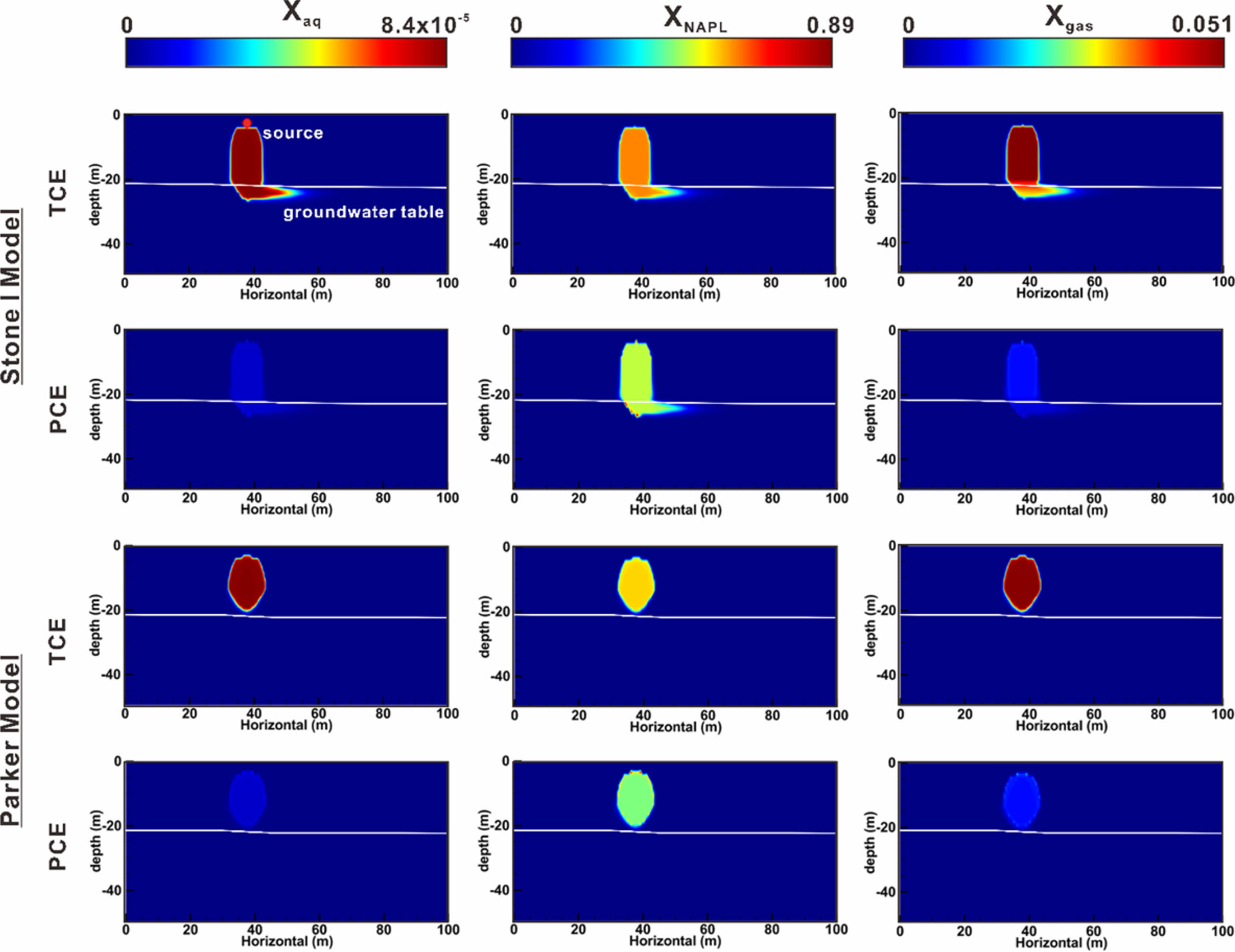 평균적인 몰분율 수치가 비슷하더라도, Stone I 모델과 Parker 모델에서 DNAPL 성분의 거동 양상은 큰 차이를 나타내었다. 예로 Stone I 모델에서 DNAPLs은 8년후 지하수면에 도달한다. DNAPLs일부는 밀도가 물보다 무거운 특성에 의해 지하수면 아래로 침투 지하수 흐름 방향으로 거동하는 양상을 나타내었다. 반면 Parker 모델에서 DNAPLs은 동일 기간동안 지하수면에 도달하지 못하고 불포화대에 머물러 있었다.