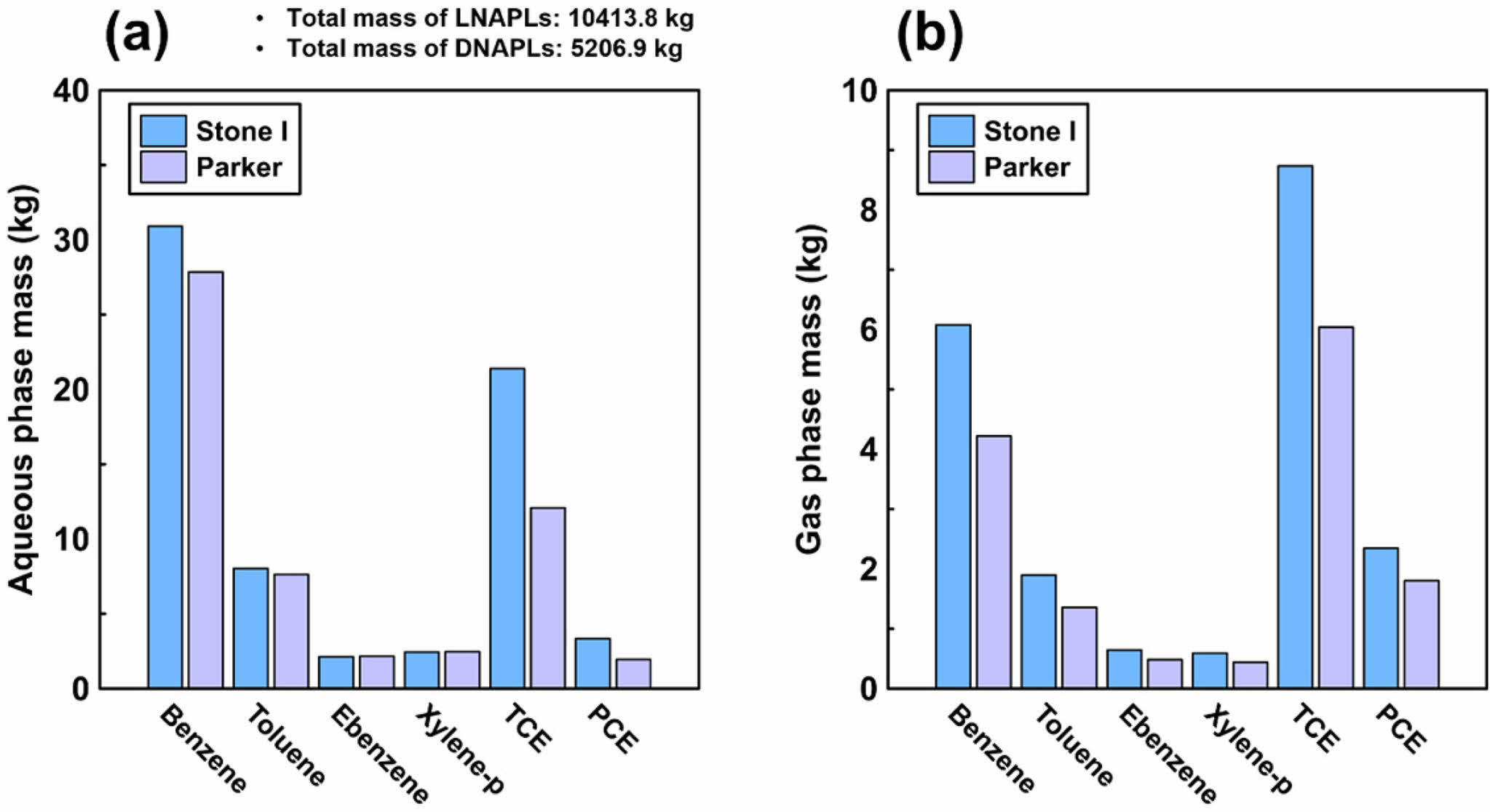 Stone I 모델과 Parker 모델 선택에 따른 LNAPLs과 DNAPLs의 포화도 및 몰분율 분포 결과와 오염물질의 직관적인 거동 형태를 알아보았다. 그 후, LNAPLs과 DNAPLs를 구성하는 화학성분은 높은 휘발성과 용해도 특성을 보임을 고려하여, 각 성분이 수용 상 혹은 기체 상으로 상변화하여 존재하는 정도를 수치적으로 계산하고 상대투수율 함수 모델 간의 차이를 비교 분석하였다(Fig. 10). 모델 영역 내에 존재하는 총 LNAPLs과 DNAPLs의 질량은 Stone I과 Parker 모델에서 거의 동일하게 10413.8 kg과 5206.9 kg으로 각각 산출되었다. 그러나 각각의 화학 성분이 수용 상 혹은 기체 상으로 상변화하는 정도는 Stone I과 Parker 모델에서 차이를 보였다. 계산 결과, 거의 모든 화학 성분에 대해서 Stone I이 Parker 모델보다 물에 용해되거나 기화하는 양이 같거나 큰 것으로 나타났으나, 자일렌과 에틸벤젠의 수용 상 상변이 수치는 Parker 모델에서 약간 더 높은 값을 나타났다. 가장 큰 변화를 나타내는 LNAPLs 성분인 벤젠이 물에 용해된 양은 Stone I 모델과 Parker 모델에서 각각 30.9 kg 그리고 27.9 kg이었으며, 톨루엔(각 8.0 kg, 7.6 kg), 자일렌(각 2.4 kg, 2.4 kg), 에틸벤젠(각 2.1 kg, 2.2 kg) 순으로 작아지는 값을 나타냈다(Fig. 10a). DNAPLs의 경우 LNAPLs에 비해 Stone I과 Parker 모델에서 큰 수용 상 상변이 수치 차이를 나타냈다. LNAPLs과 DNAPLs을 통틀어 가장 큰 변화값을 보인 TCE는 Stone I 모델과 Parker 모델에서 각각 21.4 kg과 12.1 kg으로 나타나 약 0.56배로 감소하는 변화를 보였다. PCE는 각각 3.3, 1.9 kg으로 나타났다. DNAPL에서 두드러지는 Stone I과 Parker 모델에서의 수용 상 상변이 수치의 차이는 오염체의 지하수면 도달 여부에 의해 야기된 것으로 해석할 수 있다. 지하수와 맞닿는 표면적이 넓은 Stone I의 모델 결과에서 더 많은 유기오염물질이 용해된 것으로 나타났다.