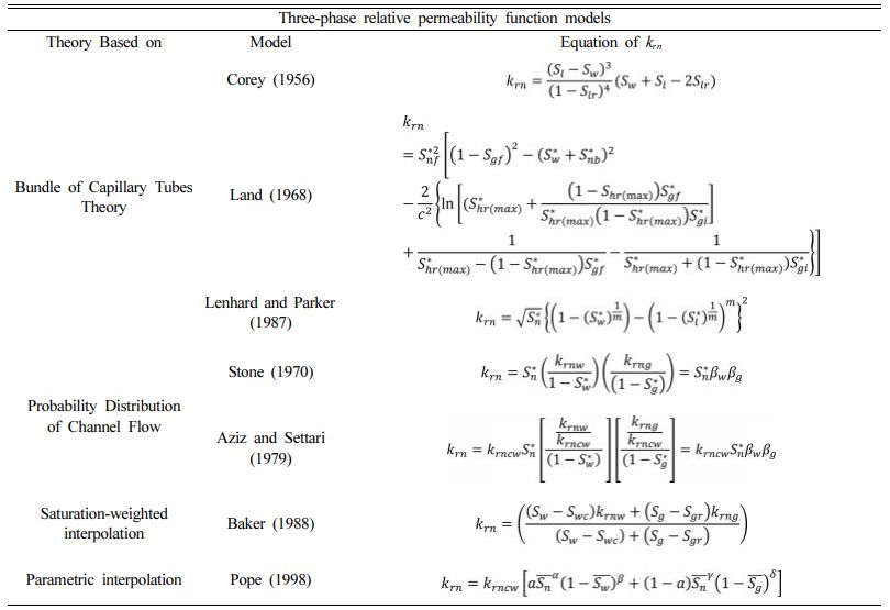 2상 유체 뿐만 아니라, Honarpour et al.(1992)은 다양한 매질에서의 3상 상대 투수율을 실험적으로 측정한 다음, 측정 자료로부터 경험적 상관식을 제시하였다. 그러나 두 가지의 상을 고려할 때와 비교하여 3상 유체 상대투수율을 실험적으로 측정하는 과정은 매우 어렵고 많은 비용이 소모된다(Essaid et al., 2015). 따라서, 수치 모델링 기법을 활용하여 오염물질 거동 예측을 목적으로 할 경우 직접 실험측정보다는 이론적/수학적 함수 모델을 활용하여 3상 오염물질 상대투수율을 추정하는 방법이 선호된다. 3 상이 공존하는 다상 유체 거동계에서 상대투수율을 이론적/수학적 함수 모델로 표현하는 방법은 모세관 다발 이론으로부터 파생된 모델(Corey et al., 1956, Land, 1968, Lenhard and Parker, 1987), 채널 유동 기반 확률 표현 모델(Aziz and Settari, 1979, Dietrich and Bondor, 1976, Stone, 1970), 기타 이론을 이용한 모델(Baker, 1988, Blunt, 2000, Pope et al., 1998)로 분류된다(Table 1).