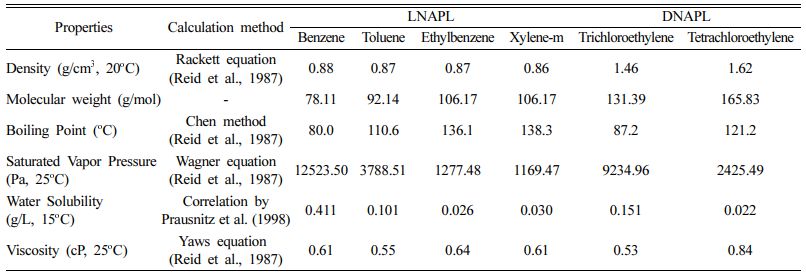 본 연구에서는 다상 유체 유동 특성 인자 선택에 의해 변화하는 유기 오염 유체의 거동특성을 규명하기 위해 총 4개의 LNAPLs 성분과 2개의 DNAPLs 성분을 고려하였다. NAPLs이 불포화대를 지나 지하수면(groundwater table)에 도착할 때, LNAPLs과 DNAPLs은 밀도 차에 의해 LNAPLs의 경우 지하수면의 위쪽에서 이동하고, DNAPLs은 침강하며 암반대수층의 경사면을 따라 거동하는 것으로 알려져 있다. 또한, LNAPLs/DNAPLs 중 높은 휘발성의 유기오염유체는 지중 내에서 기화 후 지하수와 함께 다상 유체 거동특성을 보인다. 지중 내 다상 유체 거동을 수치적으로 구현하기 위하여, 휘발성이 높은 LNAPLs 오염 물질인 벤젠(benzene), 톨루엔(toluene), 에틸벤젠(ethylbenzene), 자일렌(xylene-p)과 DNAPLs 오염 물질인 트라이클로로에틸렌(tri-chloro ethylene, TCE), 테트라클로로에틸렌(tetra-chloro ethylene, PCE)을 특정하고, 이들 오염 물질에 대한 밀도, 점성도, 증기압력을 비롯한 물리화학적 데이터베이스를 활용하였다(Table 2).
