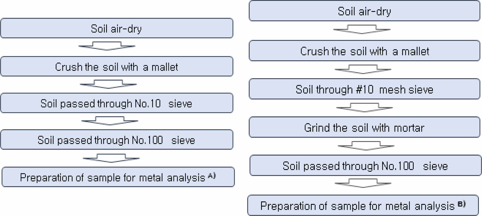 토양오염공정시험기준(NIER, 2022)에 따르면 금속류 시험용 시료 조제 방법은 100 mesh 표준체로 체거름한 토양을 사용하는데, 이 방법에는 2가지 경우가 기재되어있다(Fig. 1). 첫 번째(A)는 대상토양을 풍건 한 후 나무망치로 파쇄하여 10 mesh 표준체(눈금간격 2 mm)로 체거름한 시료를 100 mesh 표준체(눈금간격 0.15 mm)로 체거름하여 시료를 조제하는 방법, 두 번째 방법(B)은 대상토양을 풍건 한 후 10 mesh 표준체(눈금간격 2 mm)로 체거름한 시료를 막자사발 등으로 분쇄한 다음 100 mesh 표준체(눈금간격 0.15 mm)로 체거름하여 시료로 조제하는 방법이다.