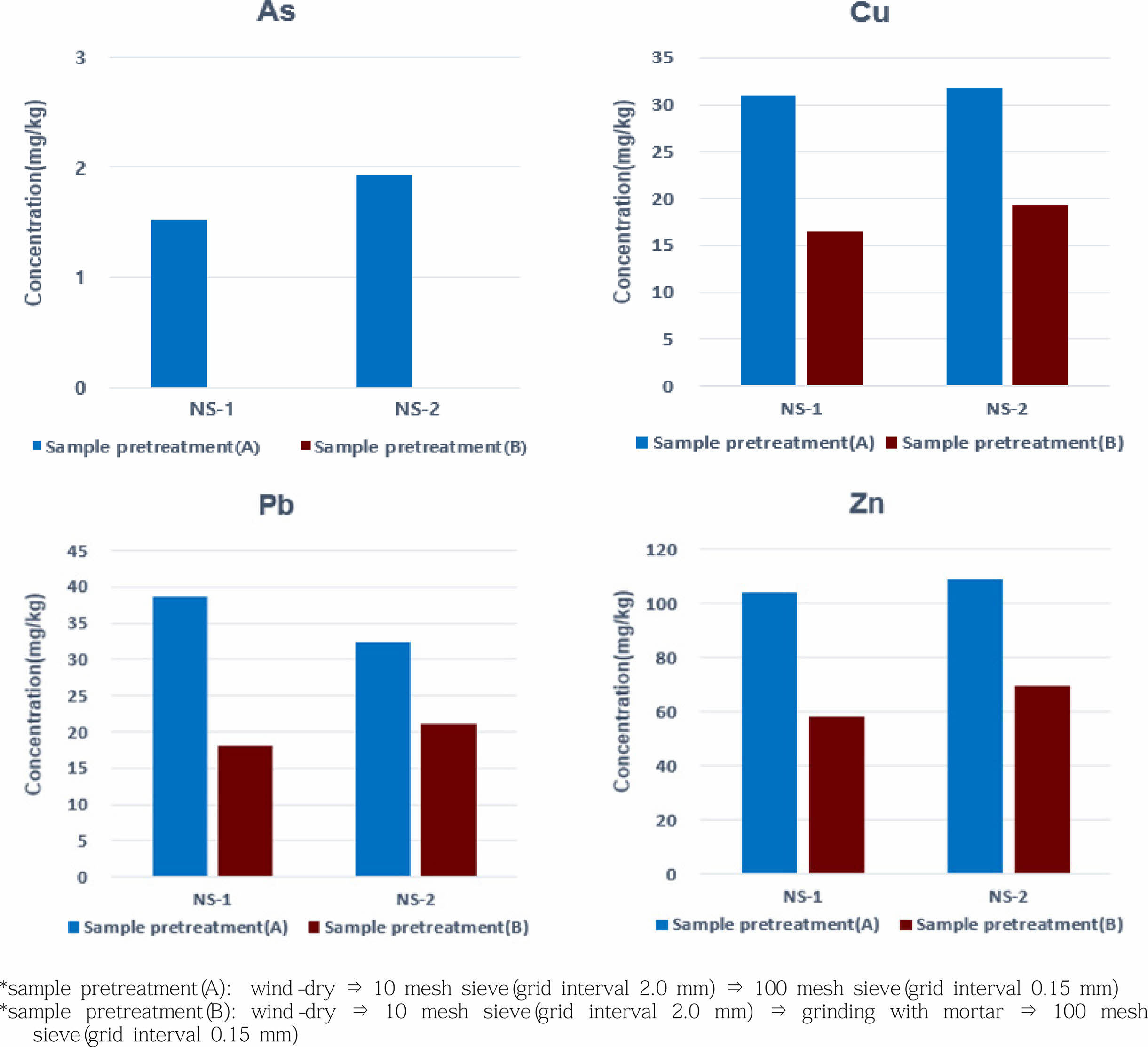 Fig. 2 Heavy metals concentration by soil sample pretreatment methods of raw soil (NS-1, NS-2). |