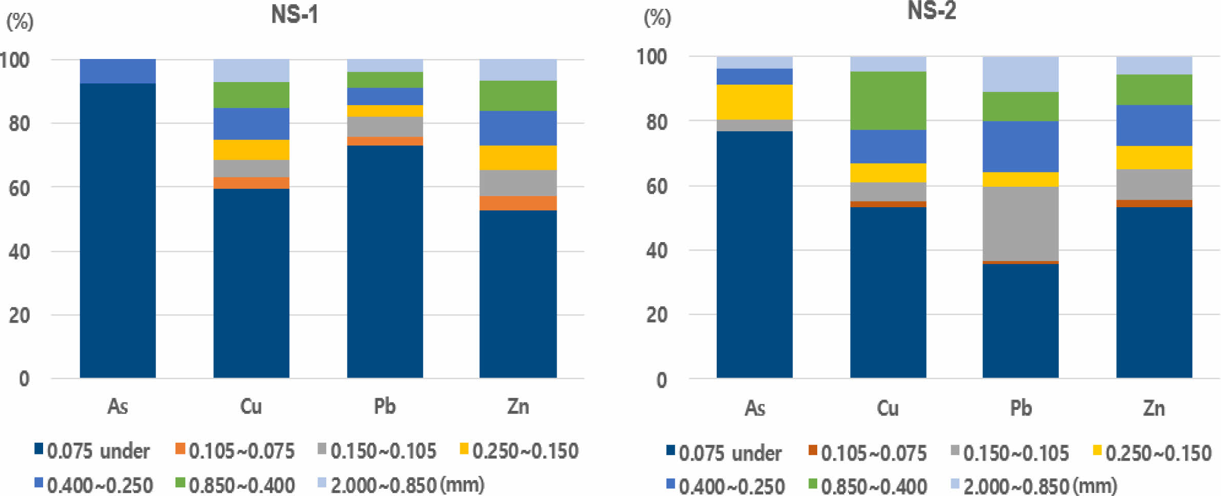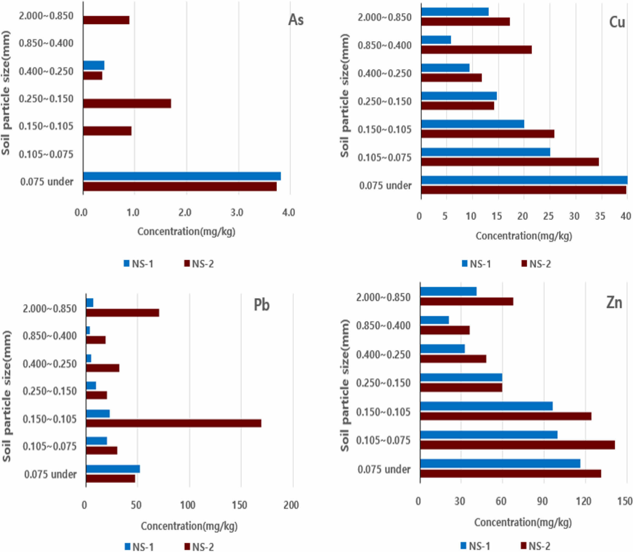 Fig. 3 Heavy metal concentration by particle sizes of raw soil (NS-1, NS-2). |