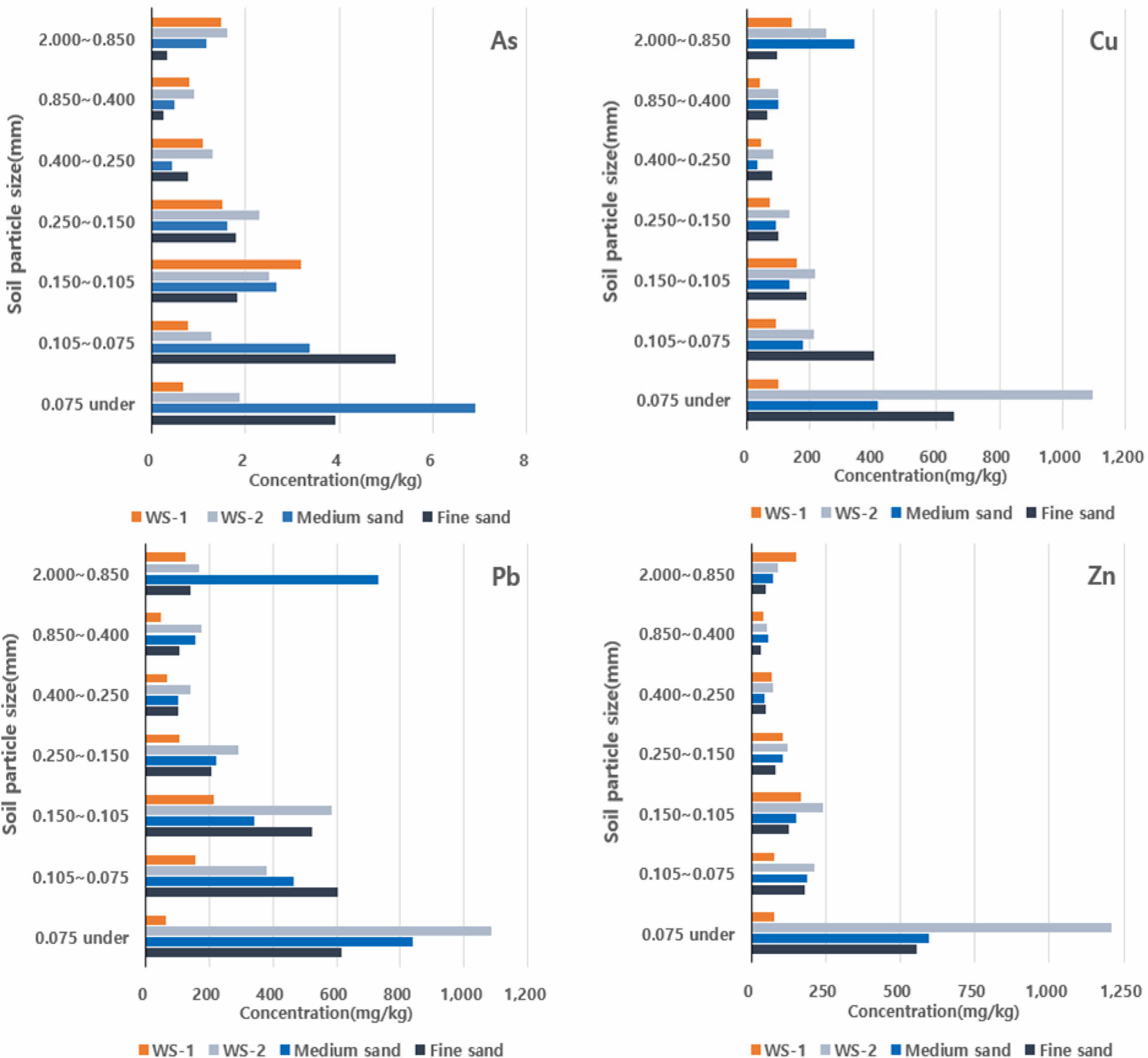 Fig. 6 Heavy metals concentration by particle size of washed soil (WS-1, WS-2, Medium sand, Fine sand). |