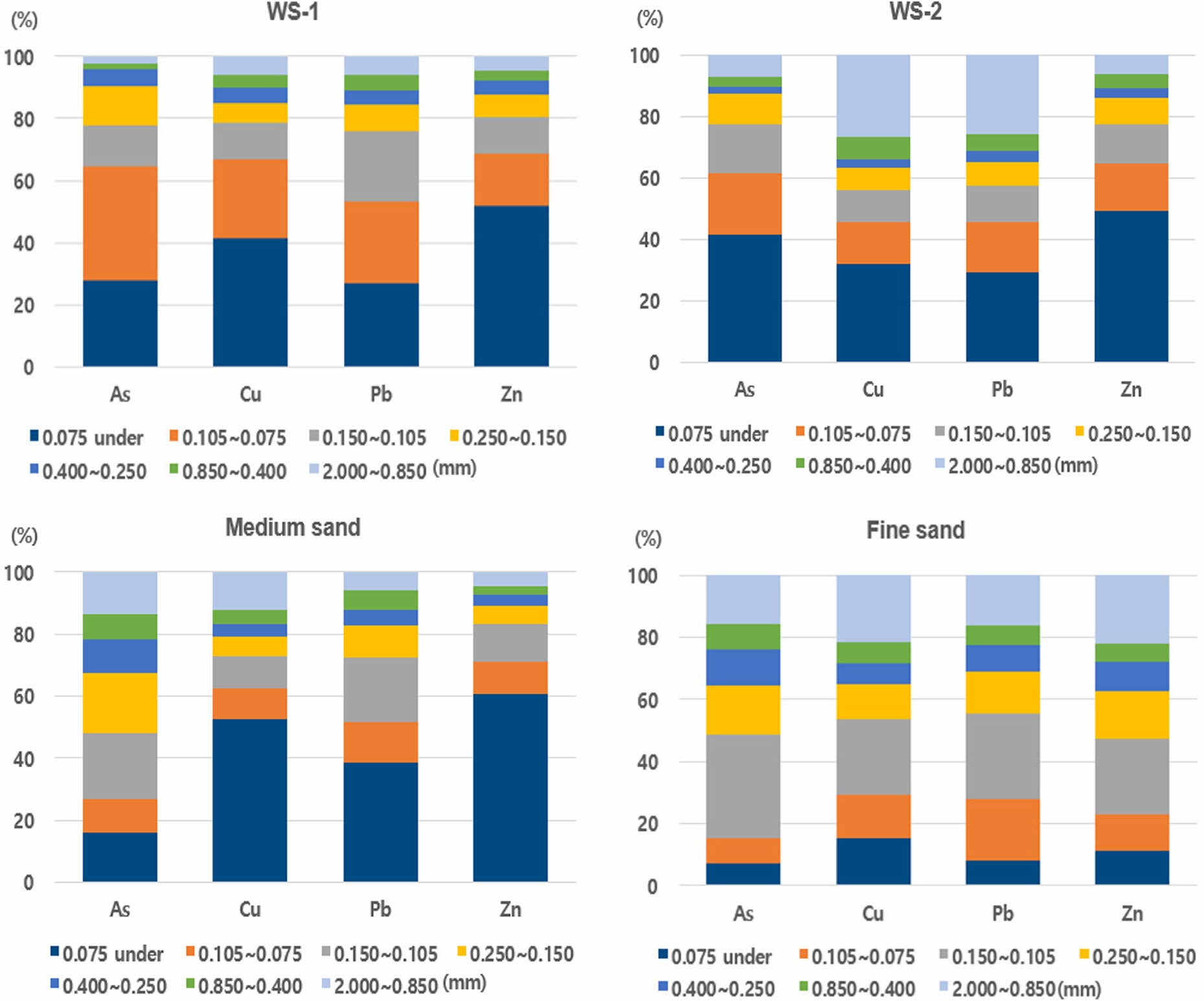 세척 토양(WS-1, WS-2, 중사, 세사)은 오염토를 왕사, 중사, 세사 그리고 슬러지로 입도분리 후 슬러지를 폐기물로 제외한 오염토을 세척한 토양이며, 이 중 WS-1, WS-2는 세척완료 후 왕사, 중사 그리고 세사를 혼합하여 적치된 야적장의 토양이다. 세척완료된 야적장 토양(WS-1, WS-2)의 입도분석 결과 중사가 각각 약 77%, 71%로 대부분을 차지하고 있으며, 100 mesh(입경 0.15 mm) 이하의 토양은 각각 4%, 11%로 나타났다. 또한 산세척 전 입도 분리되어 폐기물로 처리되어야 하는 슬러지가 세척 토양(WS-1, WS-2, 중사, 세사)에서 약 2.9% ~ 7.87%로 차지하고 있었다. 이러한 슬러지가 현장에서 세척공정 중 생겼는지 아니면 세척 정화단계 중 하나인 물리적 선별과정에서 분리가 덜 되었는지에 대하여 정화검증을 할 경우 입도분리에 대한 검토가 필요할 것으로 보인다. 토양의 입자크기는 인체에 노출되는 중금속 농도 뿐 아니라 중금속의 생체접근성에도 영향을 준다고 하였다(Bergstrom et al., 2011; Juhasz et al., 2011). 따라서 토양세척시 토양의 입경별 선별은 매우 중요한 인자가 된다.