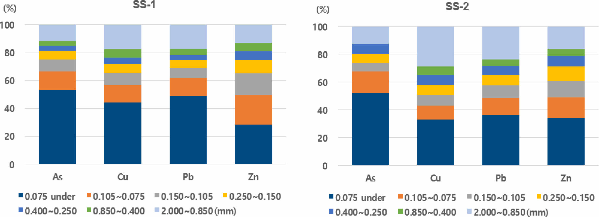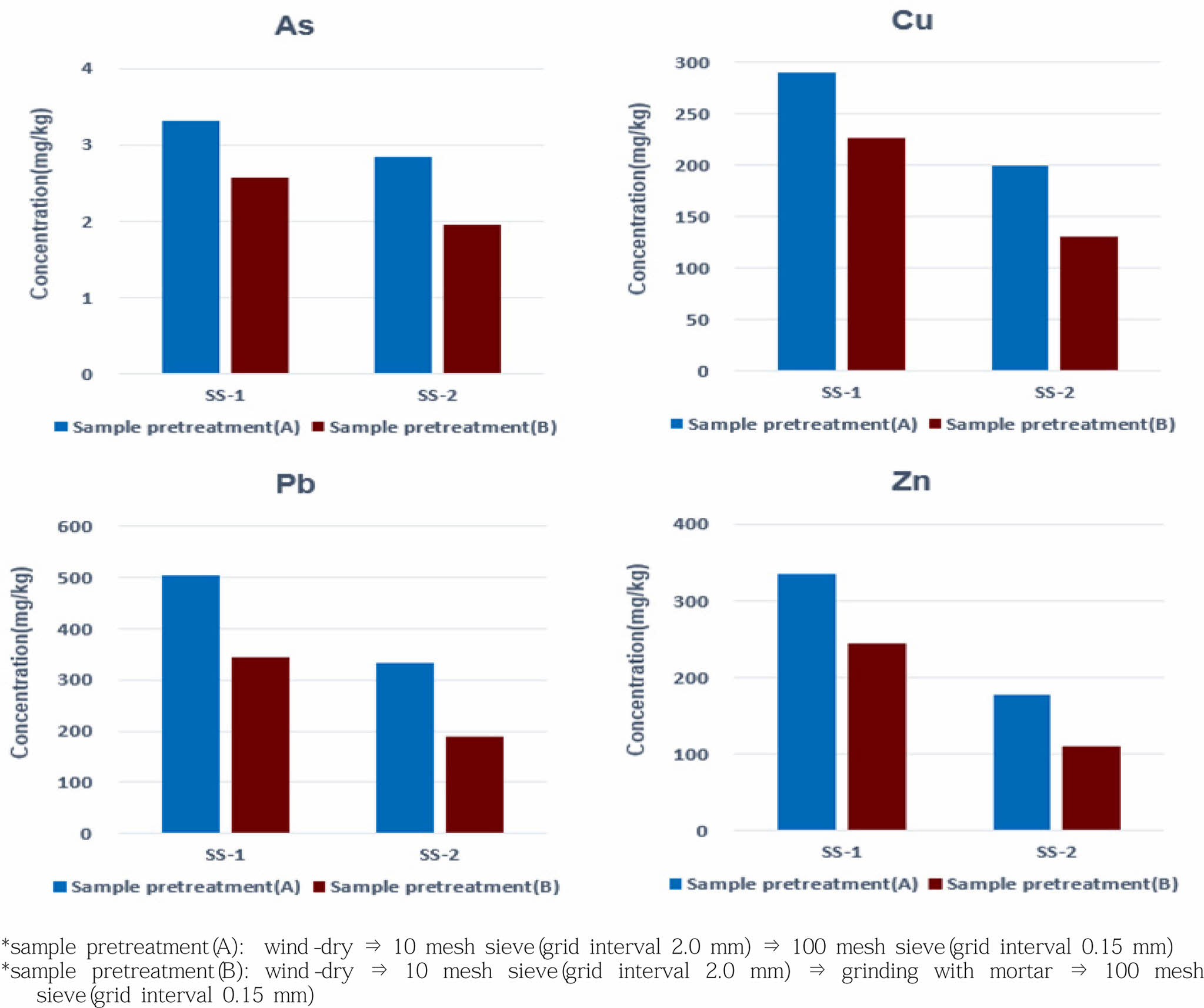 시료 조제방법(A)로 분석시 슬러지(SS-1, SS-2) 시료 모두 Cu, Pb의 농도가 각각 토양오염우려기준(1지역) 150 mg/kg, 200 mg/kg을 초과하는 것으로 나타났지만, 시료 조제방법(B)로 분석시에는 농도가 더 낮은 값을 나타내었다. 입경 크기별 중금속 농도 분석결과는 폐기물로 처리될 0.075 mm 이하의 슬러지에서 다른 입경 크기에서의 농도와 달리 고농도로 분석됨을 확인할 수 있었다(Fig. 9, Fig. 10).