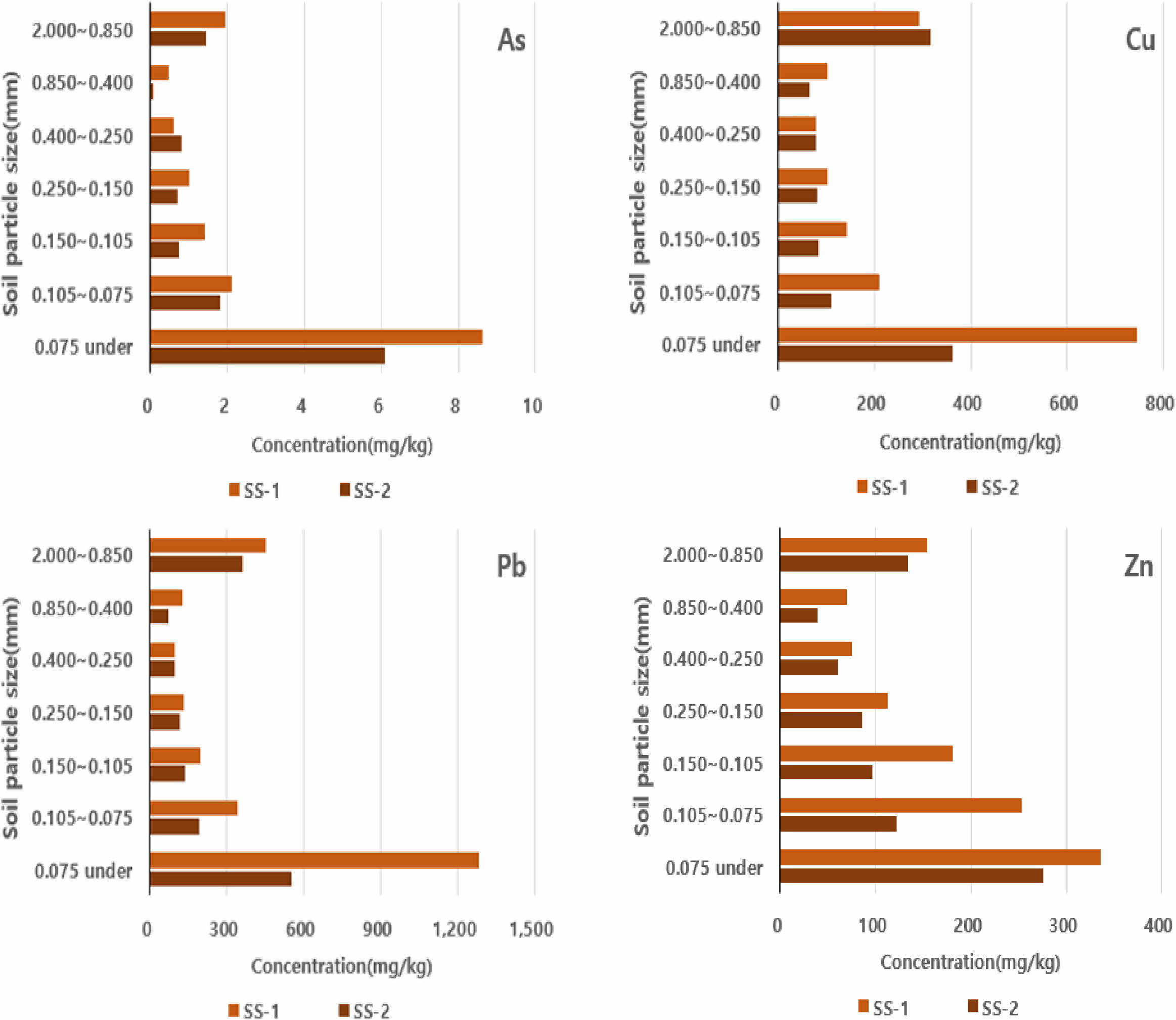 첫째, 큰 입경의 토양보다 입경이 작을수록 토양 중 중금속의 농도가 더 높게 검출됨을 확인 할 수 있었다.