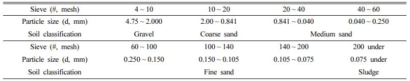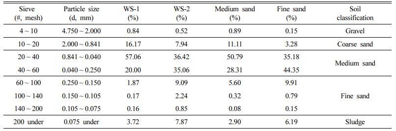 원지반 토양과 세척 완료되어 적치된 토양, 물리적 선별 후 세척공정을 거친 중사와 세사를 대상으로 각각의 토양 입도분포를 확인하기 위하여 습식 체분석을 통한 입도분석을 실시하였다. 이때 사용된 체(sieve)는 4 mesh, 10 mesh, 20 mesh, 40 mesh, 60 mesh, 100 mesh, 140 mesh 그리고 200 mesh로 Table 1에 각각의 체(sieve) 번호(#)와 눈금 크기를 나타내었다. 또한 토양은 세척정화공정에서 입경 크기에 따라 일반적으로 왕사(2.000 mm ~ 0.841 mm), 중사(0.841 mm ~ 0.250 mm), 세사(0.250 mm ~ 0.075 mm)로 구분하였다.