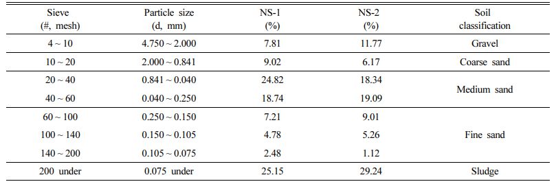 원지반 토양(NS-1, NS-2)의 입도분석 결과 자갈, 왕사, 중사, 세사 및 슬러지가 다양하게 분포되어 있으며, 100 mesh(눈금간격 0.15 mm) 이하 토양의 양이 각각 32%, 36%를 차지하고 있었다(Table 2).