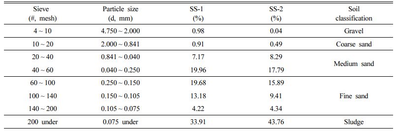 산세척 후 폐기물로 처리될 슬러지 시료(SS-1, SS-2)의 입도분석 결과는 중사가 약 27%, 26%, 세사가 약 37%, 30%이며, 입경 0.075 mm 이하의 슬러지는 약 34%, 44%를 차지하고 있는 것으로 나타났다(Table 4). 중사와 세사의 유입은 산세척 과정에서 공정수의 처리시에 일부 유입되는 것일 수 있다.