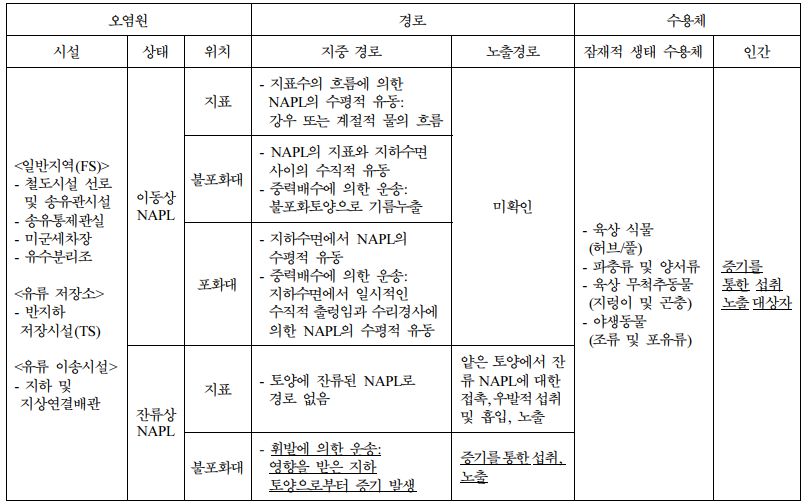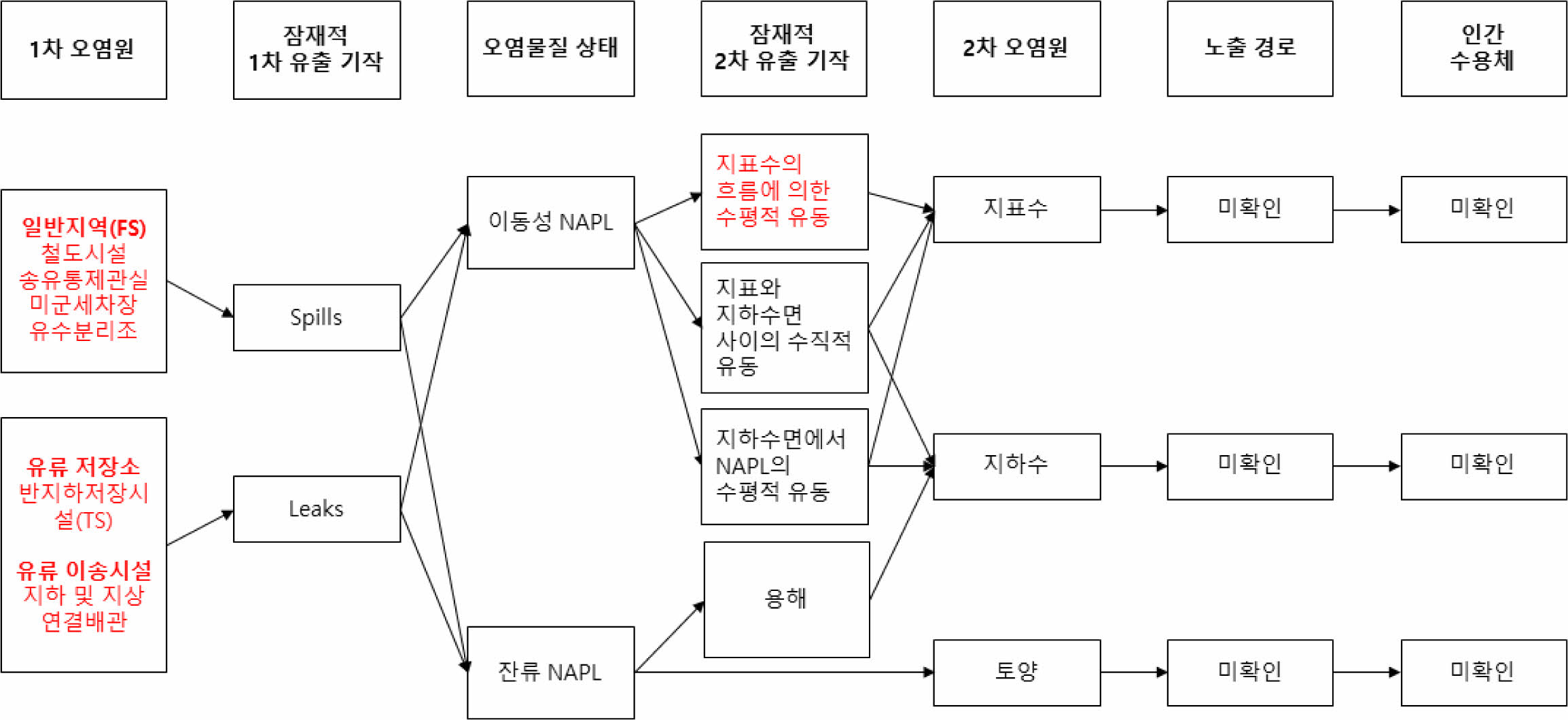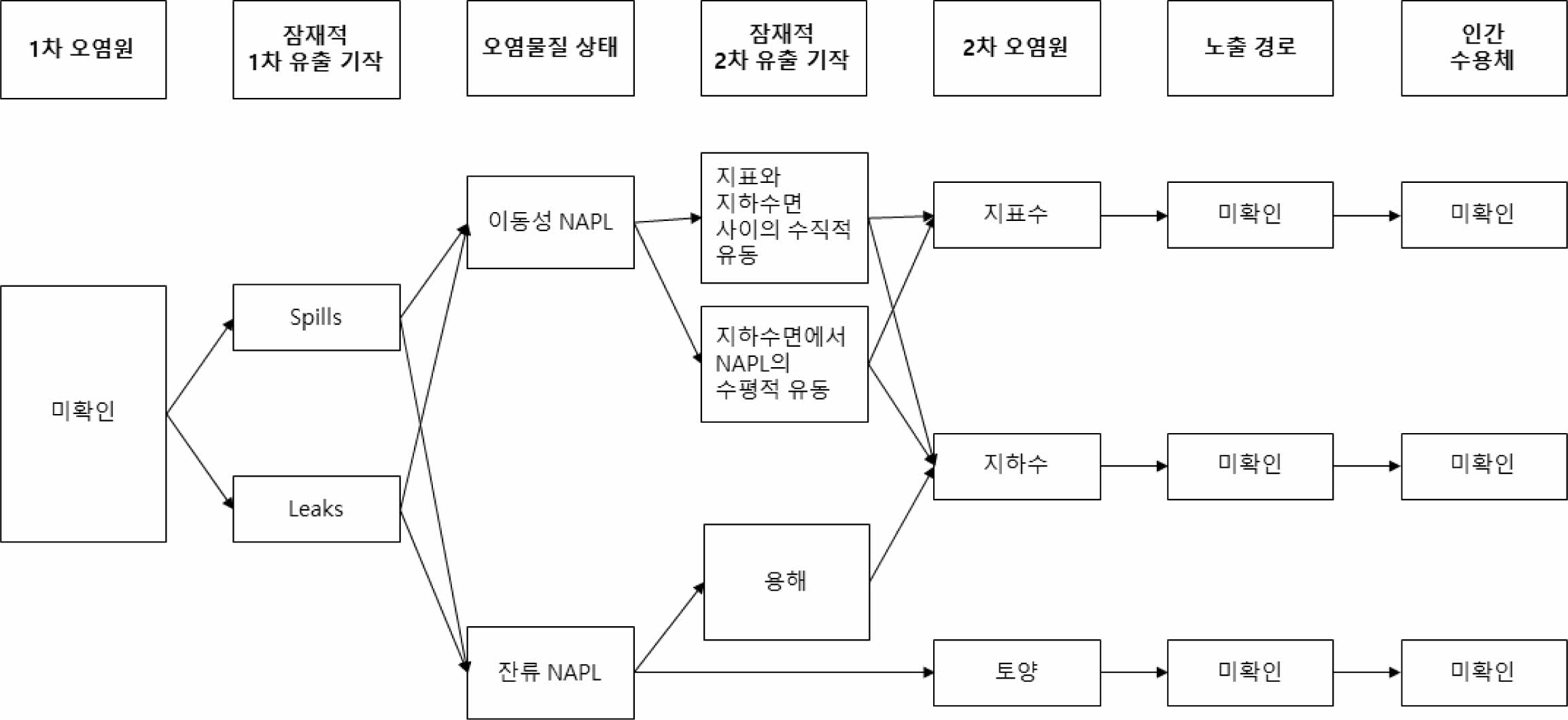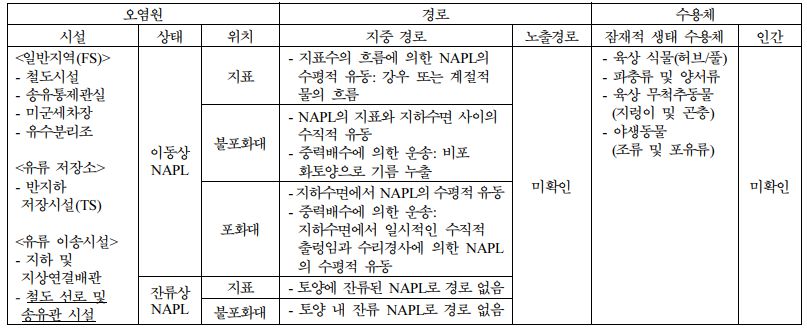 오염 개연성이 확인된 이후 정밀한 조사가 처음 이루어진 시점에서, 조사 이전까지 부지에 대해서 알려진 정보를 모두 수집하고 조사를 새롭게 수행한 결과를 요약한 부지개념모델을 작성하였다. 오염원과 경로, 수용체 등이 미확인 상태인 항목이 다수 있으며, 이는 Table 4와 Fig. 1에서 확인할 수 있다. Fig. 2의 경우 토양 및 지하수 오염에서 발생할 수 있는 간단한 경로가 묘사되었으며, Table 5에서 이에 대한 가장 통합적인 요약이 글로 작성되었다.