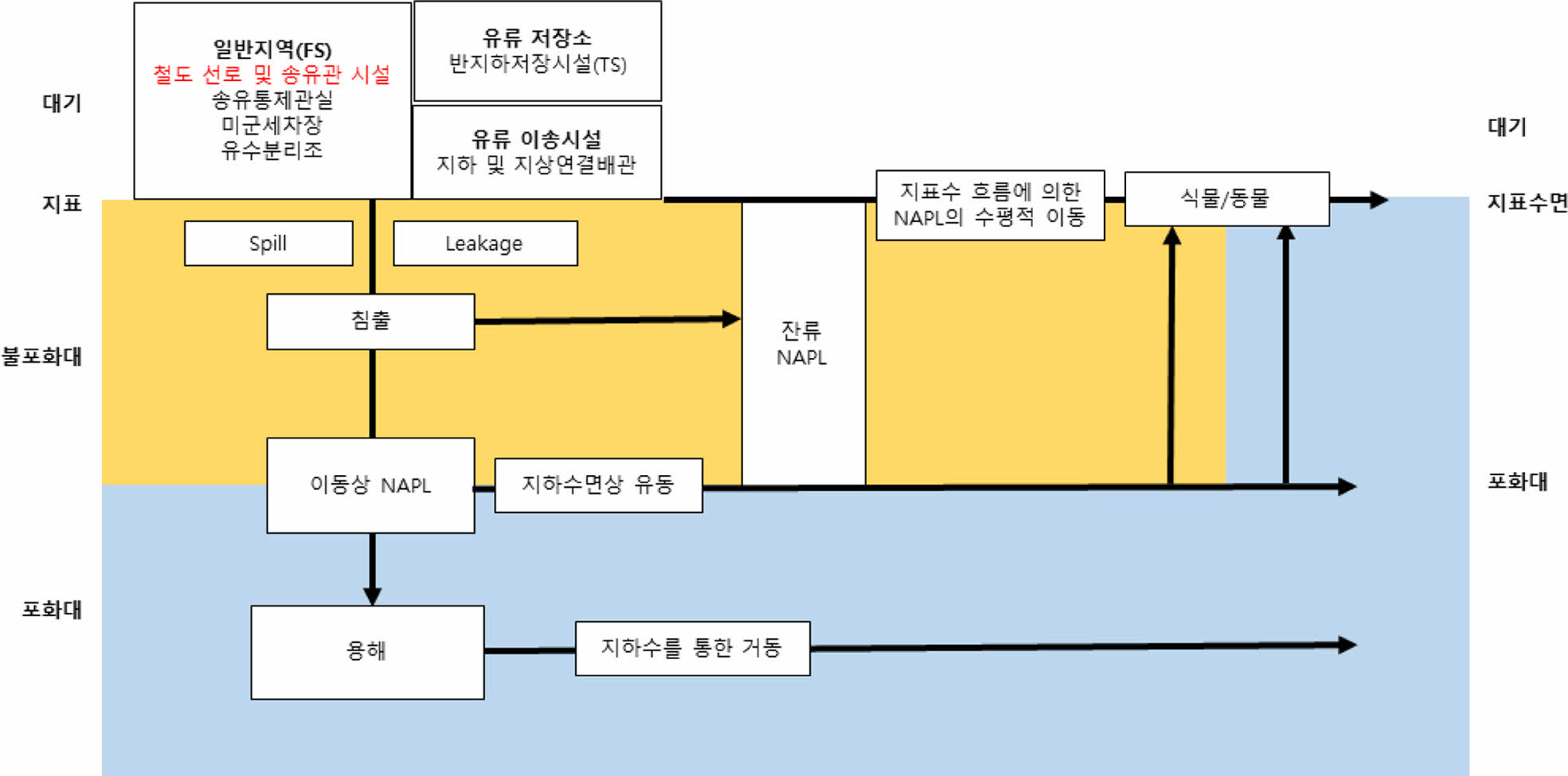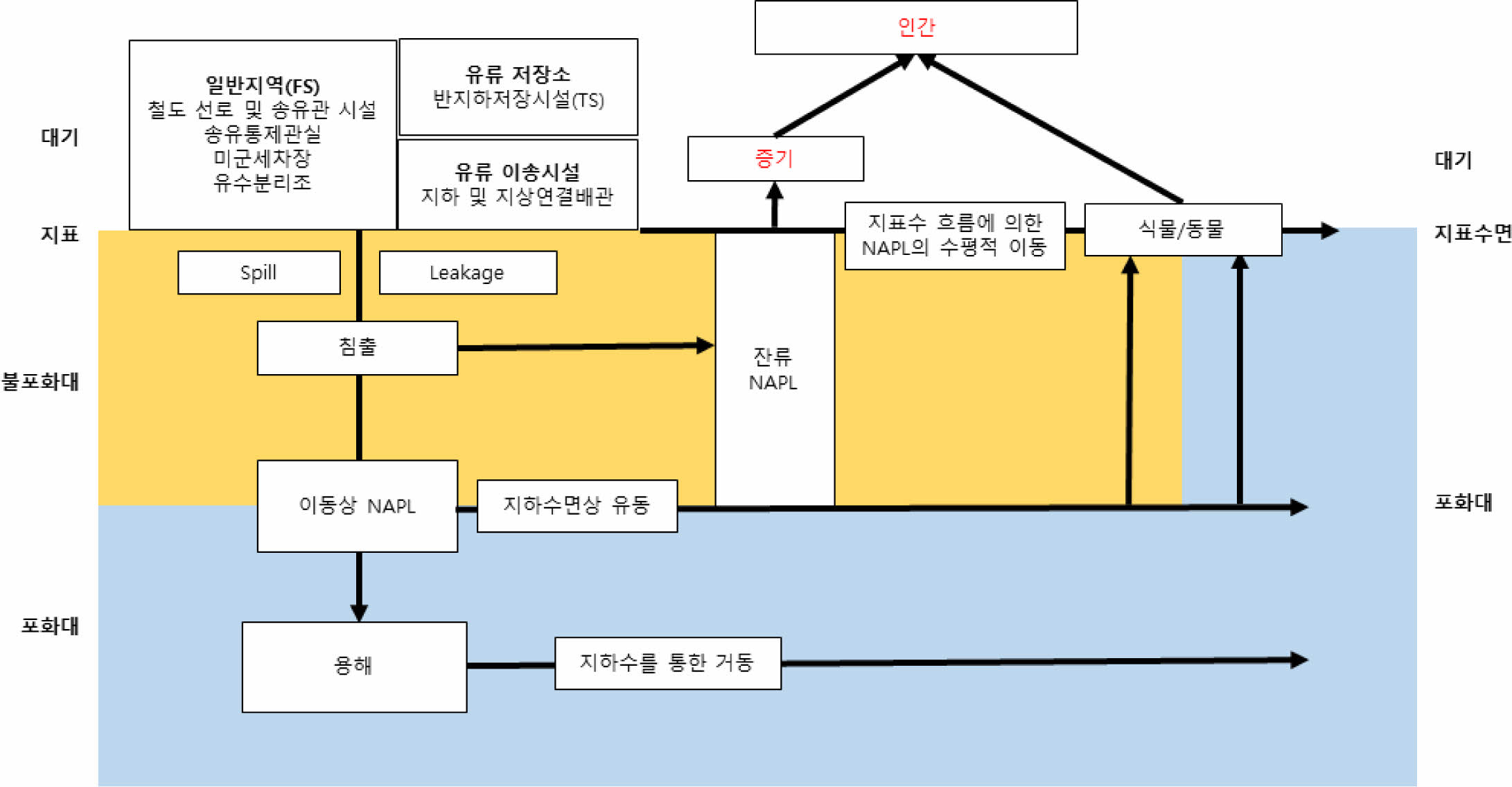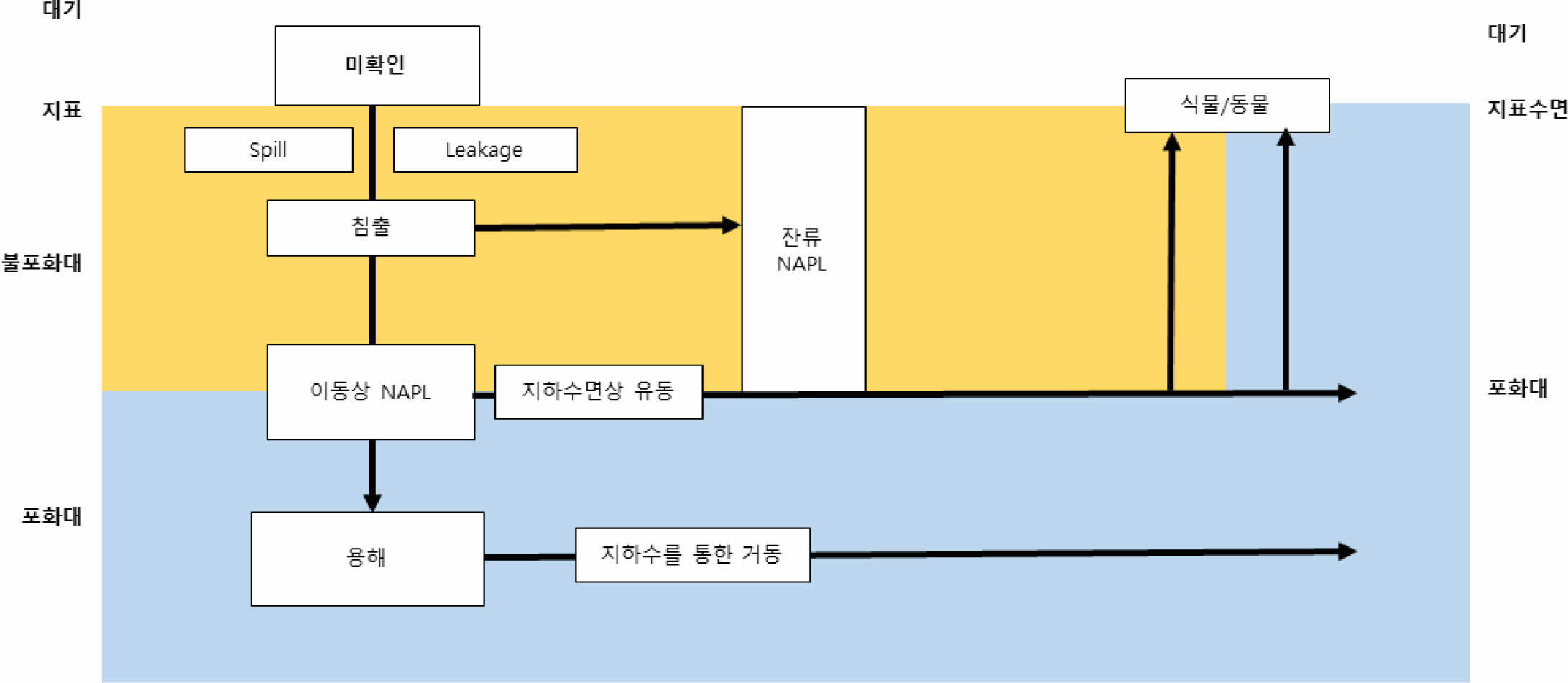 오염 개연성이 확인된 이후 정밀한 조사가 처음 이루어진 시점에서, 조사 이전까지 부지에 대해서 알려진 정보를 모두 수집하고 조사를 새롭게 수행한 결과를 요약한 부지개념모델을 작성하였다. 오염원과 경로, 수용체 등이 미확인 상태인 항목이 다수 있으며, 이는 Table 4와 Fig. 1에서 확인할 수 있다. Fig. 2의 경우 토양 및 지하수 오염에서 발생할 수 있는 간단한 경로가 묘사되었으며, Table 5에서 이에 대한 가장 통합적인 요약이 글로 작성되었다.