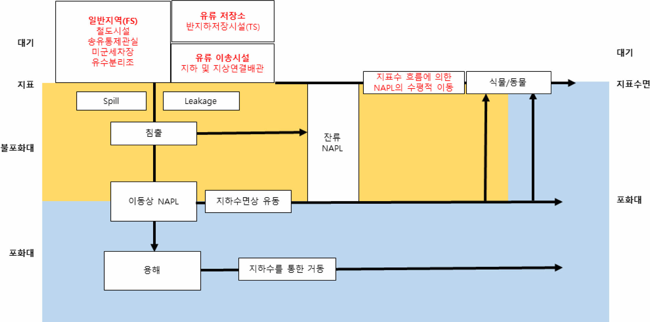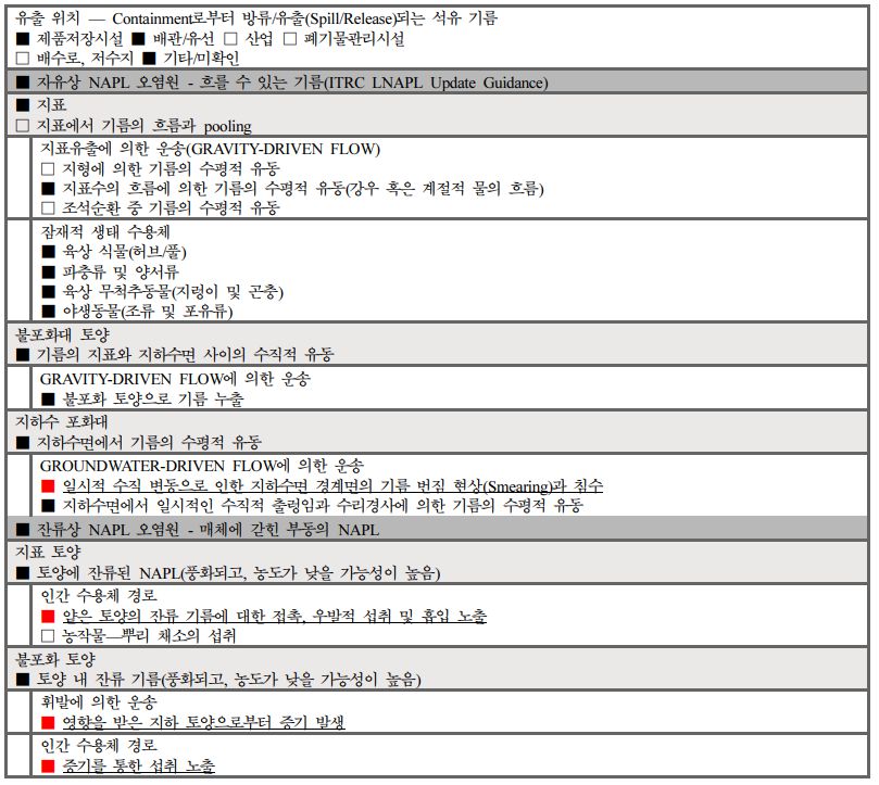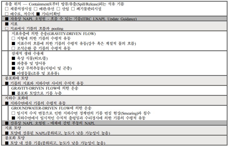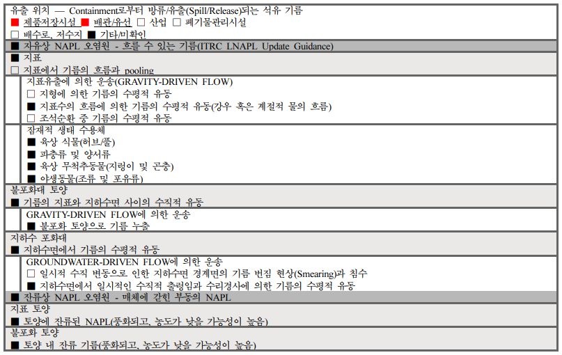 조사연차별 주요 경로는 ITRC의 ‘TPH Risk Evalua- tion at Petroleum-Contaminated Sites(ITRC, 2018)를 이용하여 확인하였다. 네 차례의 토양오염조사 결과에서 명확히 확인된 경로만을 체크하였고, 해당 조사 시점에 확인된 사항을 기반으로 갱신된 경로는 빨간색 사각형과 밑줄을 표기하여 구분하였다. 2012년의 경우, 오염조사 결과에서 오염우려기준을 초과한 오염이 불포화대 영역과 지하수에서 검출되었으므로, 불포화대 토양과 지하수 포화대를 체크하였다. 위 오염의 영향을 받는 잠재적 생태 수용체는 오염이 발견된 주변에 있을 것으로 간주하여 체크하였다. 2017년에는 오염원이 지하저장탱크와 송유관임이 확인된 점과 청취조사에서 강우가 발생할 때 소하천에서 기름을 목격한 사실을 토대로 자유상 NAPL이 지표수의 흐름에 의해 수평적 이동함을 확인하였다. 2019년에는 오염원에 선로 및 송유관시설만 추가되었으므로 2017년의 체크리스트는 변동이 없었다. 2020년은 유류의 취기가 심한 곳을 추가 시료 채취를 한 사실이 있으므로 이에 따라 인간 수용체 경로를 새로 고려할 필요성이 대두되었다. Table 1~3은 Profiles 중 체크리스트에 해당하는 자료가 확인된 항목만을 체크하여 주요 오염원, 경로, 수용체 요소 파악을 위해 사용하였다.