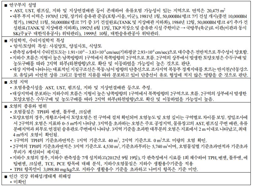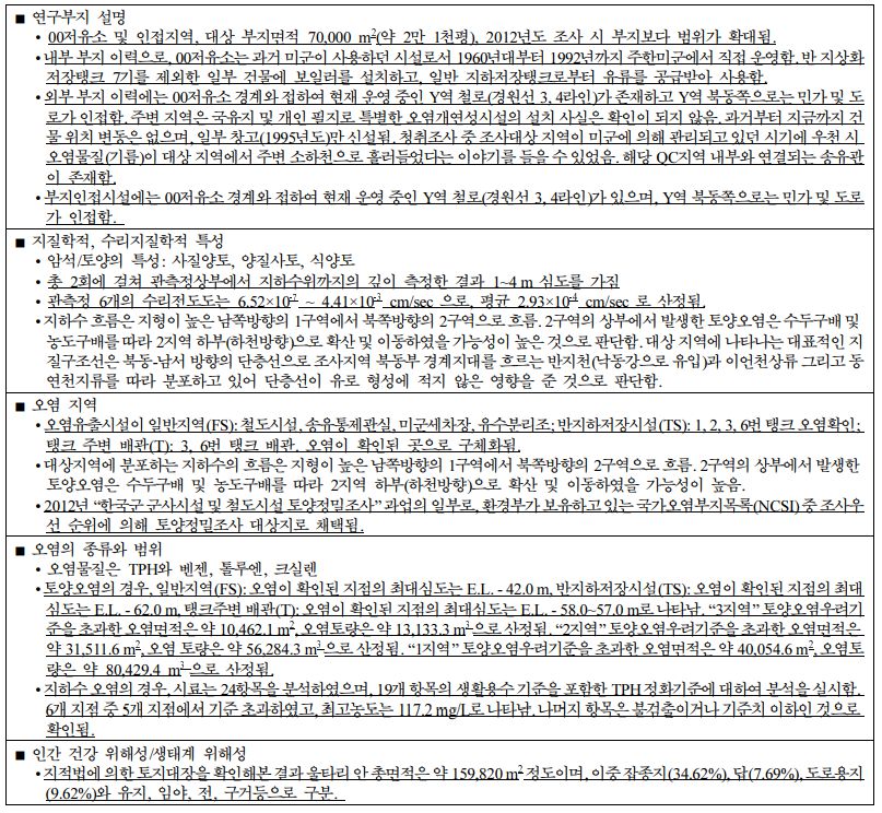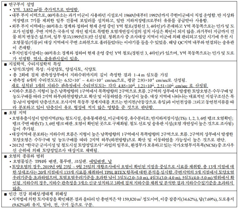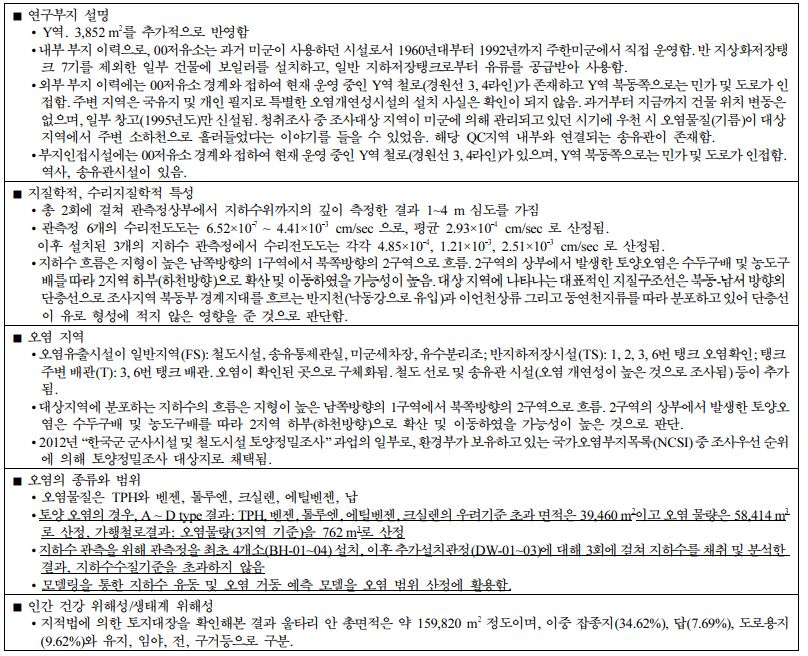 연구부지는 경상북도에 위치한 Y부지로 1960년부터 주한미군기지로 사용되었으며, 유류 저장 및 운반을 위한 송유관이 존재했던 곳이다. 주요 오염개연성 시설은 지상유류저장탱크(AST) 2기와 지하유류탱크(UST) 6기, 대용량 지하유류탱크(UST) 7기 그리고 송유관 시설이 있다. 현재 위 저장탱크와 배관으로부터 누수, 노출된 LNAPL로 인해 토양 및 지하수가 오염되었으며, 최근 2020년에 정화설계를 위한 추가오염조사가 이루어졌으며, 현재 정화 과업이 수행되고 있다.