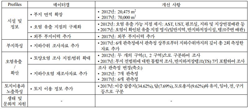 오염부지의 조사범위는 조사 차수가 증가함에 따라 넓어지며, 토양시료 채취 또한 구역을 나누어 수행하고, 수직적 오염도를 알기 위해 세분화하여 수행함을 확인할 수 있다. 따라서 부지특성은 점점 상세해지고, 지속적으로 보완되는 방향으로 개선되는 것을 확인할 수 있다. 오염원의 경우, 2012년의 오염조사에서는 오염원을 특정할 수 없었으나 2017년 조사에서 반지하저장시설 및 배관 등이 오염원임을 확인하였다. 오염물질 또한 조사 차수에 따라 변화하였는데, 2012년에는 벤젠, 톨루엔, 크실렌, TPH까지 네 가지 항목이었으나 2017년에 토양오염우려기준을 넘는 에틸벤젠과 납이 검출되었다. 이러한 형태의 조사자료 관리는 과거 부지 이력, 현재 부지 현황 파악 및 향후 오염 변화 예측을 통해 오염부지 관리를 위한 통합적 데이터 관리에 유용하게 사용할 수 있다.
