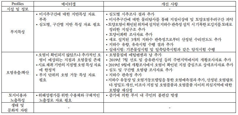 지반특성을 파악을 위해 시추자료를 확인하였으나, 얕은 시추심도와 적은 시추 수로 인한 정보의 부족으로 심도별 층서특성 및 지반 추정에 어려움이 있었다. 또한 수용체 관련 정보의 부재로 위해성 평가 대상이 불분명한 점이 개선될 필요가 있었다. 이러한 데이터 갭 해석을 기반으로 한 개선 사항을 Table 12에 제시하였다.