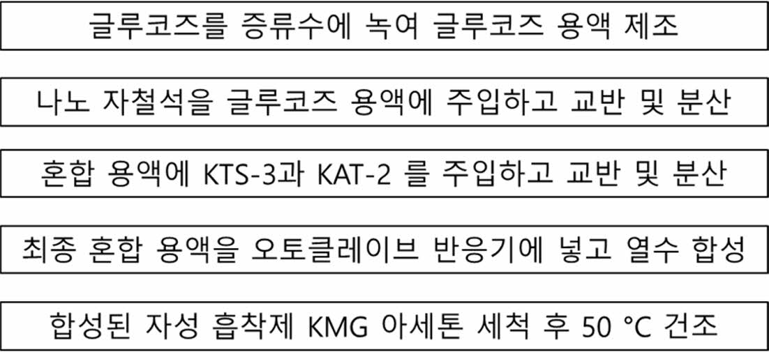 자성 Cs 흡착제 KMG 제조 방법은 이해를 돕기 위해 Fig. 1과 같이 모식도로 표현하였다. KTS-3 또는 KATS-2, 나노 자철석, 글루코즈를 준비한 뒤 다음과 같이 무게를 측정하였다. 열수화 반응기에 먼저 DIW를 파이펫(pipet)으로 3 mL 담은 후 글루코즈를 첨가하고 물에 글루코즈가 잘 녹았는지 확인하였다. 글루코즈가 완전히 녹은 다음, 미리 무게를 재어 둔 나노 자철석을 첨가하여 충분히 교반하고, 그 다음 KTS-3 또는 KATS-2를 첨가하고 혼합 물질들이 전부 잘 섞일 수 있도록 충분히 스푼으로 저어주었다. 반응기 캡을 완전히 닫아준 후 오븐에 넣고, 오븐 온도를 160ºC로 설정해주었다. 반응 6시간이 끝난 반응기를 후드 안에서 식힌 후 캡을 해체하였다. 그리고 고체 생성물을 접시(weighing dish)에 덜어서 옮기고 50oC 오븐에서 6시간 이상 건조시켰다. 아세톤 세척을 위해 증류수 30 mL을 conical tube에 담아준 후, 원심 분리를 위해 양쪽 무게를 양팔 저울로 맞춰주었다. 원심분리기에 넣기 전 시료들이 충분히 물과 교반 되어 세척될 수 있도록 충분히 흔들어 준 후 4,000 rpm, 10분으로 설정하여 원심분리 후 상등액은 따라 버리고 새로 증류수 30 mL을 첨가하여 5번 과정을 2번 더 반복하여 총 3번의 증류수 세척 과정을 거쳤다. 상등액을 따라 버린 코니칼 튜브(conical tube)에 아세톤을 30 mL 첨가한 후 증류수 세척 과정과 동일하게 세척 및 원심 분리를 3회 진행하였다. 세척이 완료된 시료를 50oC로 설정된 오븐에 넣은 후 6시간 이상 충분히 건조 시켰다.