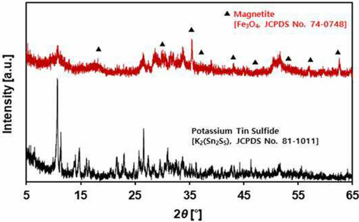 Fig. 5는 KTS-3과 KMG의 XRD 분석 결과이다. 원재료로 사용된 KTS-3 물질은 전형적인 K2(Sn2S5) 구조의 층상 황화 금속 물질의 성상(JCPDS No. 81-1011)을 보였다. 그리고 KMG의 XRD 스펙트럼을 보면 Fe3O4 (JCPDS No. 74-0748) 해당하는 피크(peak)들이 관찰되면서 KTS-3 흡착제 표면에 자철석 입자들이 붙어있는 것을 확인할 수 있다. 자성 회수한 분말들(KMG)의 XRD 분석 결과임을 고려할 때, 나노 자철석이 글루코즈 탄화층에 의해 층상 황화 금속 물질 표면에 안전하게 첨착 되어 있음을 확인할 수 있다.