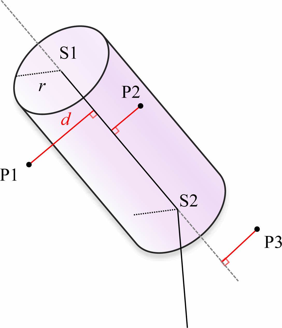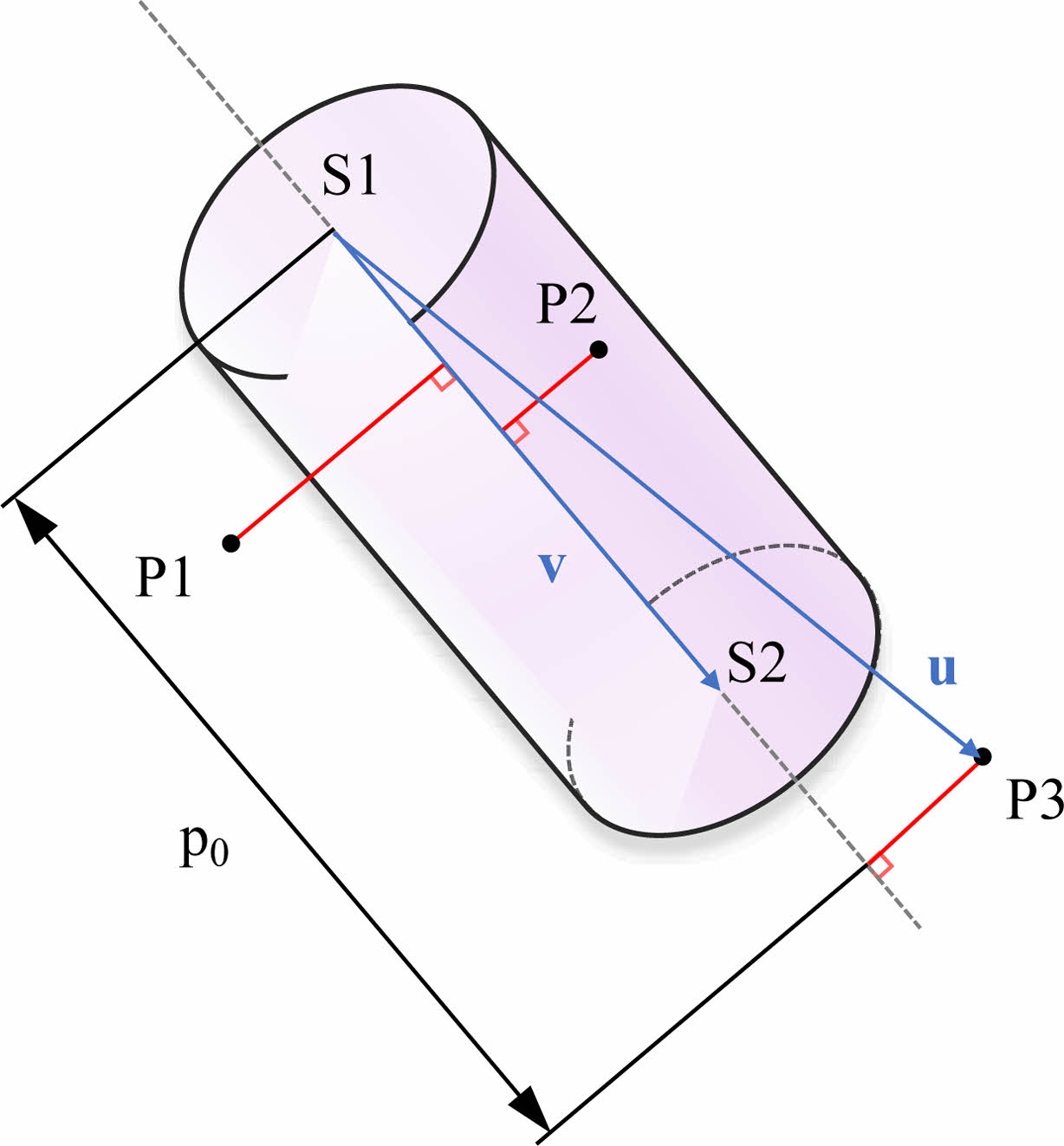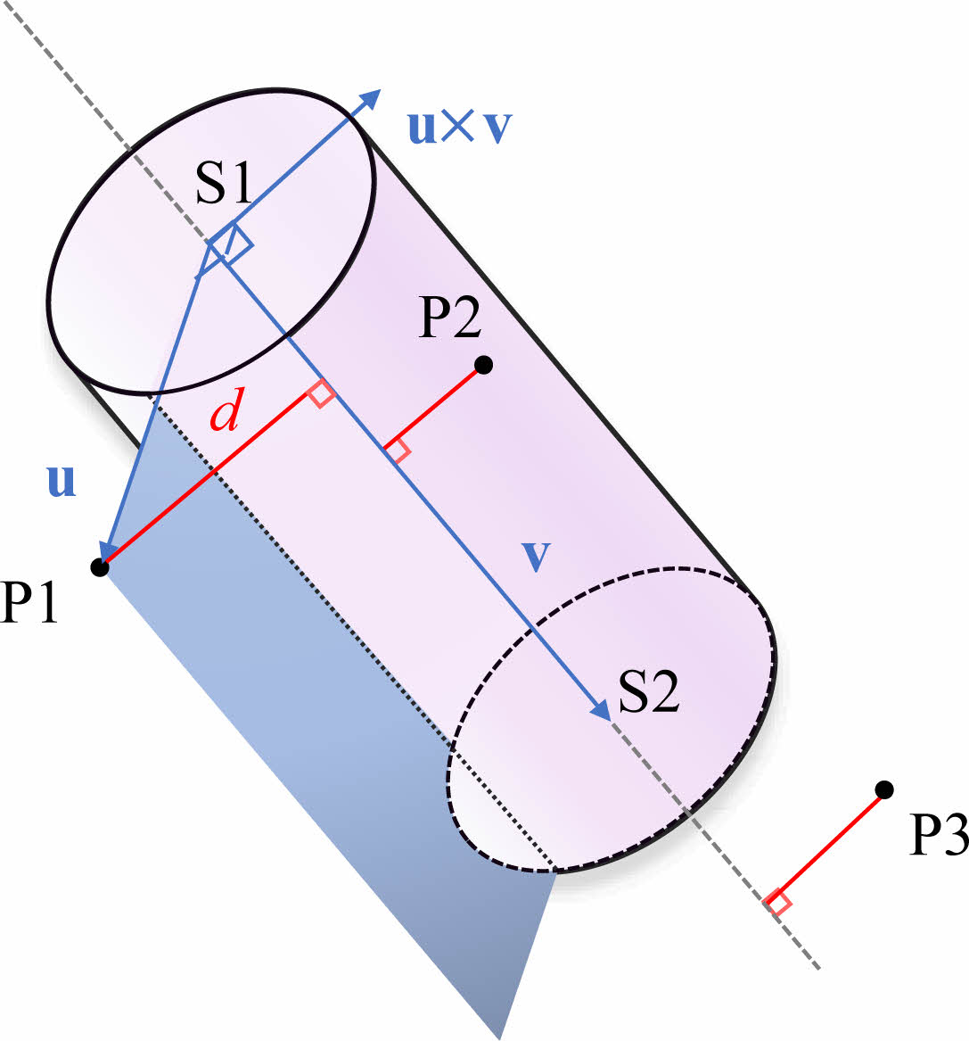 원통 내부에 격자점이 포함되는지를 평가하기 위해서는 우선 원통 축과 격자점 사이의 거리(d)가 원통 반지름(r)보다 작거나 같아야 한다. 원통 축과 격자점 사이의 거리를 계산하기 위해서 공간벡터의 외적 크기를 활용할 수 있다(Fig. 2). 선분 S12의 시작점 S1에서 S2를 향하는 벡터를 v라고 하고, 선분의 시작점 S1에서의 임의의 격자점(Fig. 2에서는 격자점 P1)에 이르는 벡터를 u라고 하면, 벡터 u와 v가 이루는 평행사변형의 넓이는 다음과 같다.