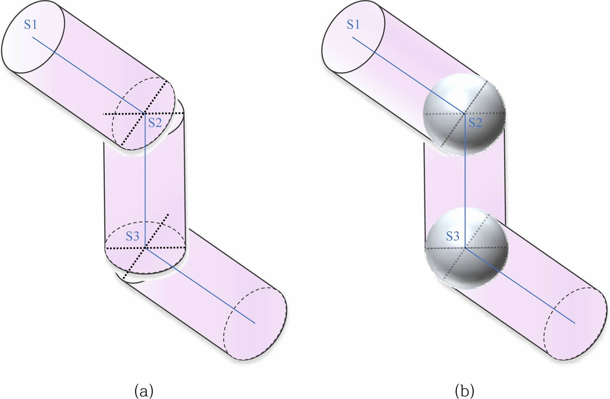 Fig. 4 Schematic diagram for determining whether a grid point is located in the gap between cylinders; (a) occurrence of gaps between cylinders, (b) filling of gaps with spheres. |