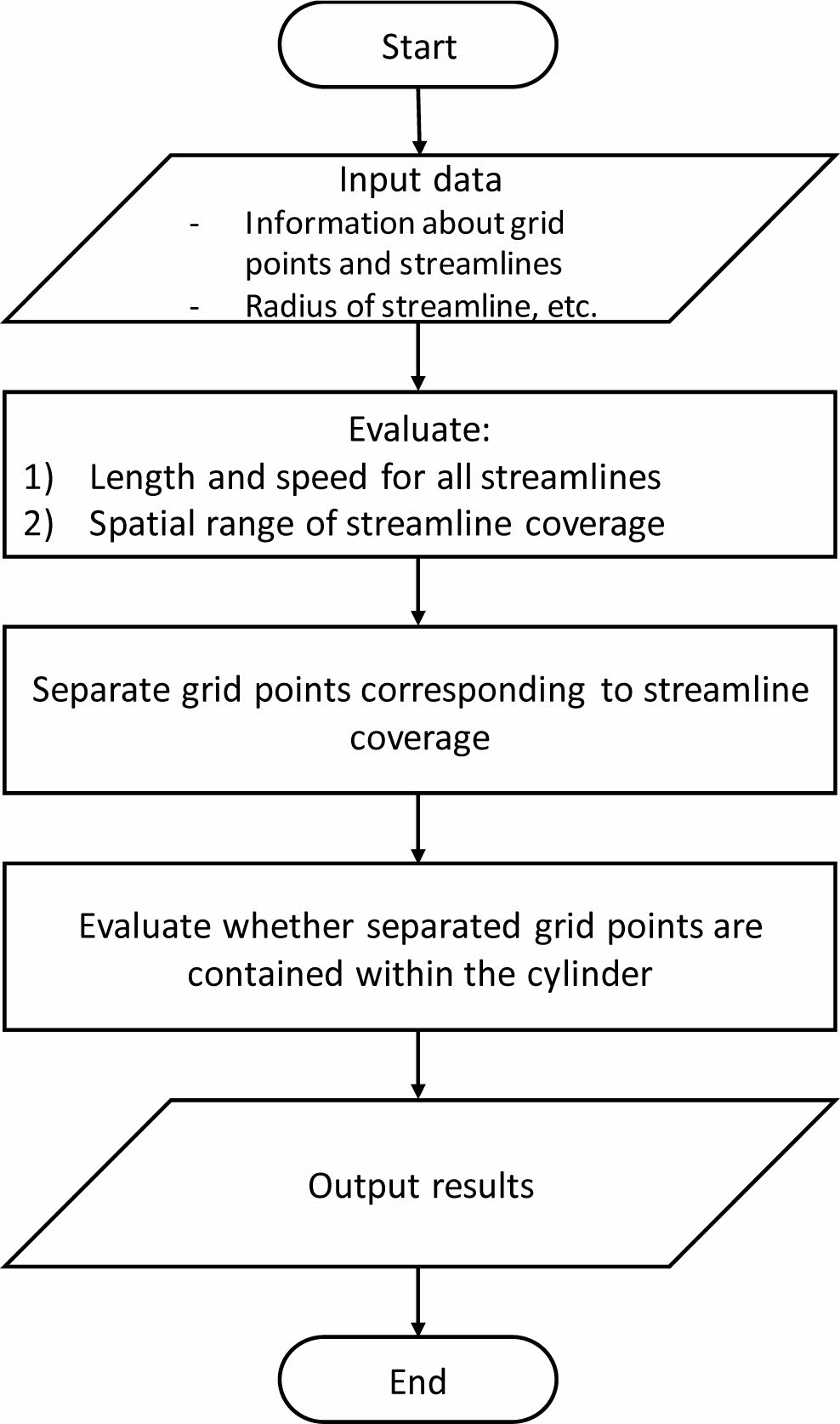 Fig. 5는 유선 분석법에 대한 흐름도를 나타내고 있다. 프로그램을 구동하면 일단 입력값이 요구되는데, 수치 모형을 구성하는 모든 격자점 정보와 모의된 유선 정보 및 유선을 원통으로 가정했을 때의 반경이 입력자료에 해당한다. 공간좌표와 격자점 번호, 그리고 해당 격자점에서 평가된 Darcy 유속값이 격자점 정보에 해당한다. 유선 정보로는 절점 및 정점의 공간좌표와 경과시간이 요구된다. 입력이 완료되면, 모든 유선의 길이와 속력을 평가하게 된다. 모든 격자점에 대해서 유선마다 평가를 반복하는 것은 비효율적이므로, 유선이 존재하는 소규모 직사각형 영역에만 포함되는 격자점을 분리한 후, 주어진 반경의 원통 내부에 위치하는 격자점 정보를 상술한 알고리즘을 이용하여 추출하게 된다. 원통 내부에 위치하는 모든 격자점 정보를 평가하여 결과를 출력한 후, 프로그램은 종료된다.