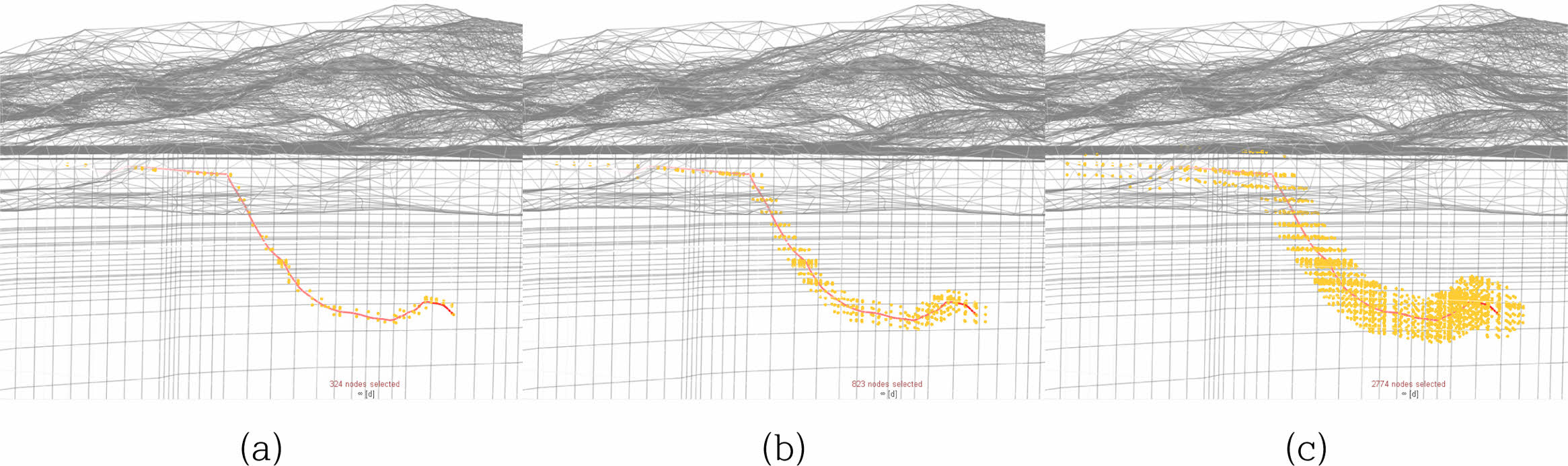 Fig. 6 Change in number of captured grid points depending on streamline radius; (a) r = 5 m, (b) r = 10m, (c) r = 20 m |