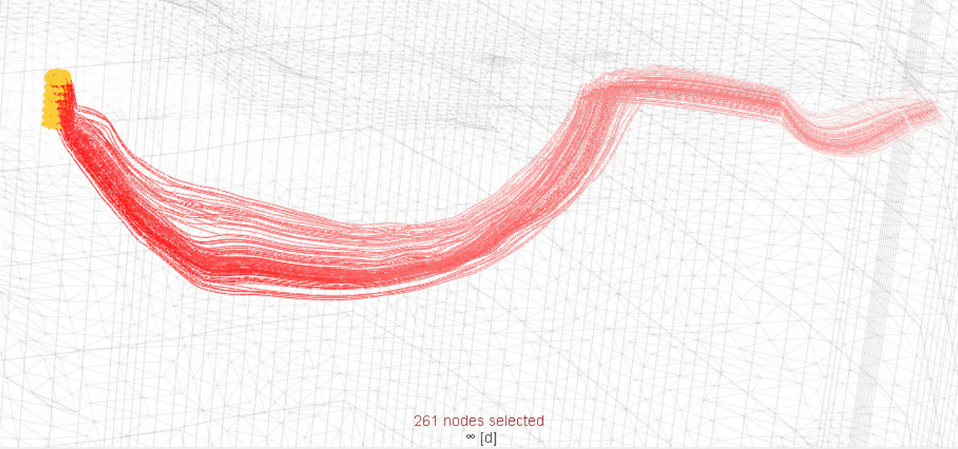 Fig. 7은 261개 입자(그림에서 노란색 점)를 설정하였을 때 총 234개의 다중 유선(그림에서 빨간색 선)이 모의된 결과를 보인다. 총 212만 개의 격자점 중에서 Fig. 7과 같은 다중 유선이 차지하는 소규모 영역에 포함되는 격자점 개수는 142,618개이다. 모의된 총 234개의 유선 중에는 발생 직후에 소멸하는 유선도 존재하게 되며, 따라서 유선의 최소 길이를 설정하여 그 이하의 길이를 갖는 유선은 평가에서 제외할 필요가 있다. 본 사례에서는 1.0 m를 최소 유선 길이로 설정하였으며, 그 결과 234개 유선 중 118개의 유선만이 평가 대상으로 선정되었다. Table 2는 118개 유선을 평가한 결과이다. 118개의 유선 각각에 포획되는 격자점은 유선마다 다르므로, 길이와 유속에 대한 118개의 값을 얻을 수 있고, 따라서 최소, 최대, 평균, 표준편차 값을 산정할 수 있다.