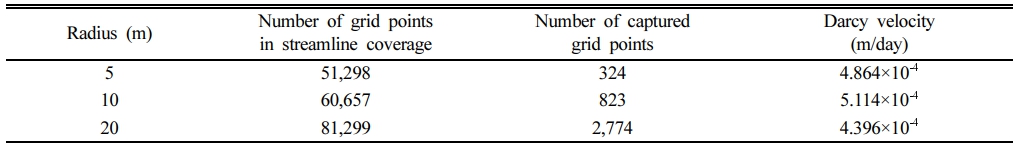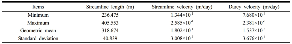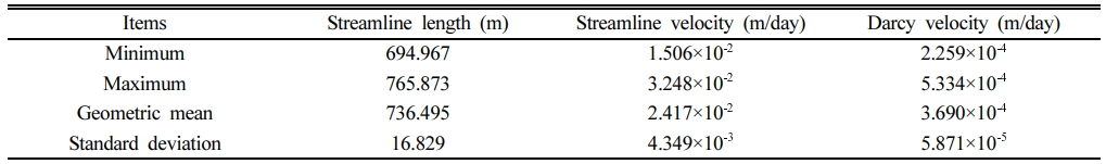 또한, Fig. 7과 같이 118개의 유선이 공간의 일정한 영역을 차지하는 것으로 볼 수 있으므로, 118개 유선에 포획되는 격자점을 모두 모으면 8,564개가 된다. 이러한 8,564개 격자점에서 Darcy 유속의 평균값은 2.746×10-4 m/day로 평가되며, 본 연구에서는 이를 Darcy 벌크 유속(bulk velocity)이라고 명명한다.