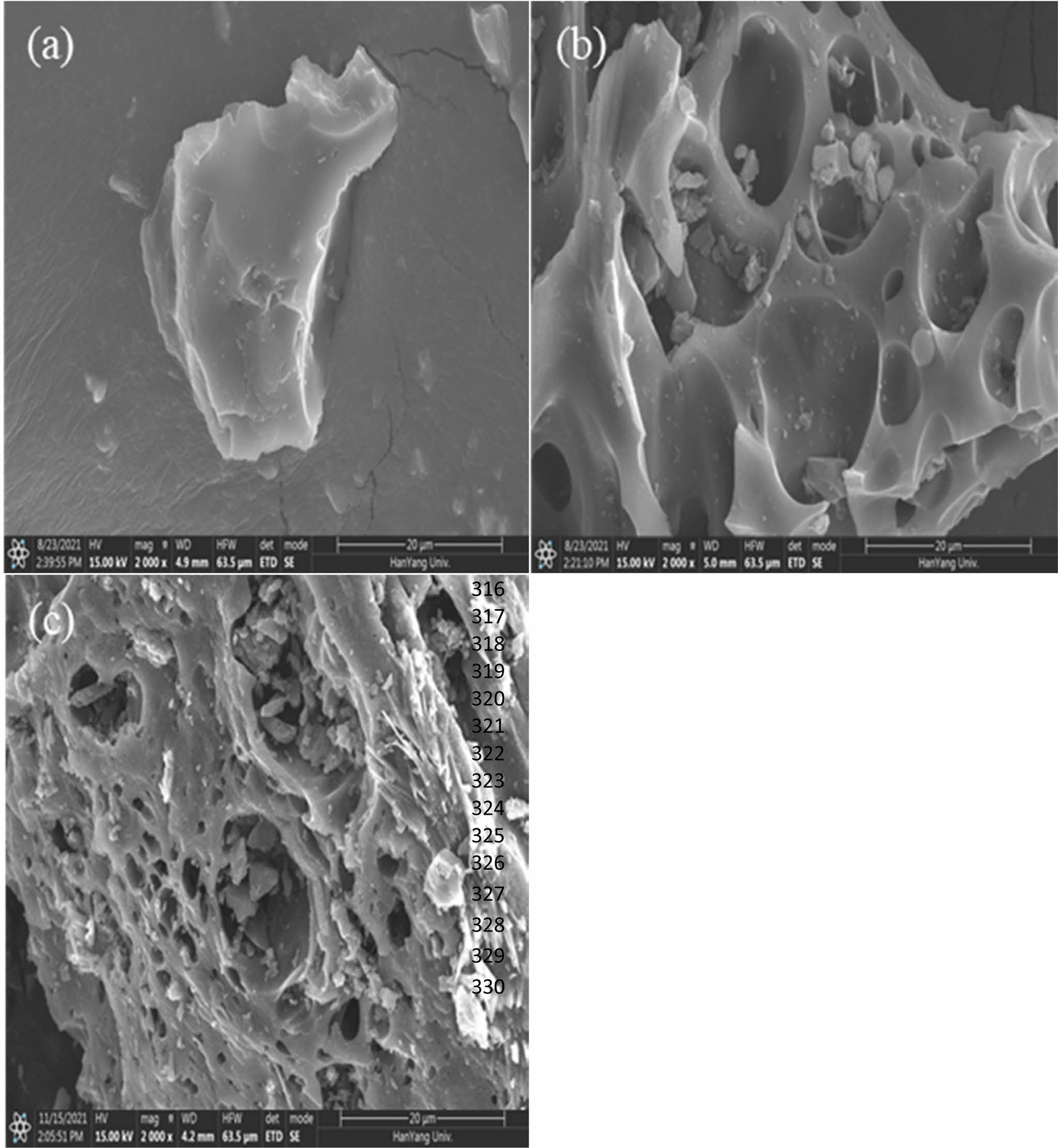 The physical shape of the activated carbon was confirmed with a scanning electron microscope (SEM) and energy dispersive spectroscopy (EDS) using a FEI Verios G4UC. Trace amounts of synthetic microparticles were sprayed onto carbon tape and transferred to an SEM grid and dried in an oven at 60oC for one day. Then, in order to prevent movement of the microparticles, a platinum coating was applied for 1 minute before the analysis. Fourier transformed infrared (FT-IR) spectroscopy with a PerkinElmer UATR Spectrum Two was used to confirm the chemical structure of the modified stabilizer. The exact elemental content of the functional groups was confirmed through X-ray photoelectron spectroscopy (XPS) using K-Alpha (Thermo Fisher Science). The zeta potential was used to measure the electrostatic interaction between ions and adsorbents by measuring surface charge. The zeta potential before and after activated carbon modification and heavy metal adsorption was measured by analyzing the supernatant with an electro-highlight scattering spectrophotometer (Perkin Elmer). The BET analyses were done at 77 K using N2 adsorption-desorption. All samples were degassed for three hours at 100oC with an argon gas flow using around 0.1 g of each sample. The Barrett-Joyner-Halenda (BJH) method was applied to compute the pore size distribution from the desorption branches of the nitrogen isotherms.