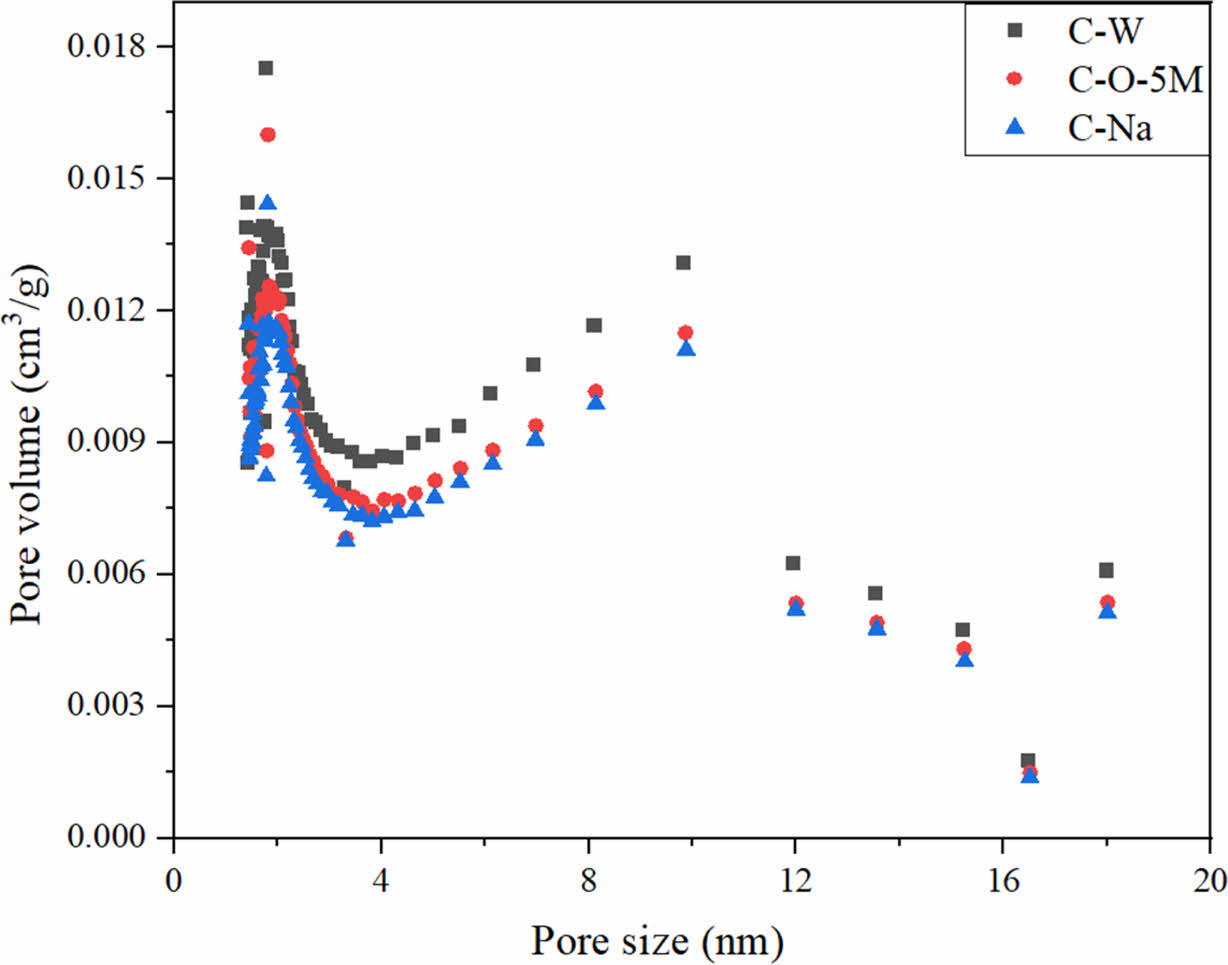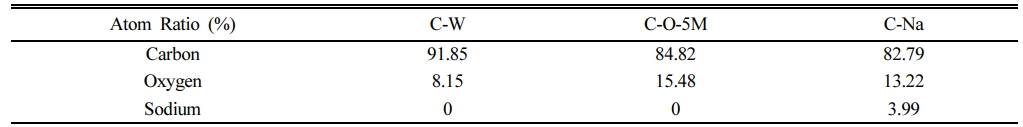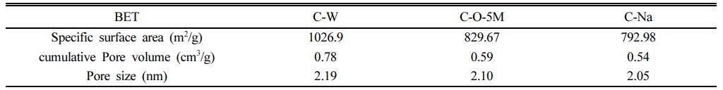 The morphology of activated carbon can be seen in Fig. 1. With oxidation, the surface of the activated carbon (C-O-5 M and C-Na) became more porous. There was no significant difference in shape between C-O-0.5M and C-Na. Fig. 2 shows an intensive distribution of 2 nm meso- pores in all three activated carbons. This pore size was also confirmed from the BET analysis in Table 1. The specific surface area of the Calgon activated carbon before modi- fication was 1041 m2∙g-1. The specific surface area of the oxidized activated carbon decreased to 829.67 m2∙g-1 due to the partial blocking of mesopores (El-Hendawy, 2003). The overall specific surface area of activated carbon with sodium decreased to a greater extent than that of activated carbon with only oxygen functional groups (792.98 m2∙g-1). This was due to the larger atomic size of sodium. The specific surface area and cumulative pore volume of the activated carbon were decreased from C-W to C-O-5M. This was due to partial destruction of the micropores by the effective attack of HNO3 (El-Hendawy, 2003). Those of C-Na were reduced to a greater extent than that of C-O-5M. This was due to the larger atomic size of sodium.