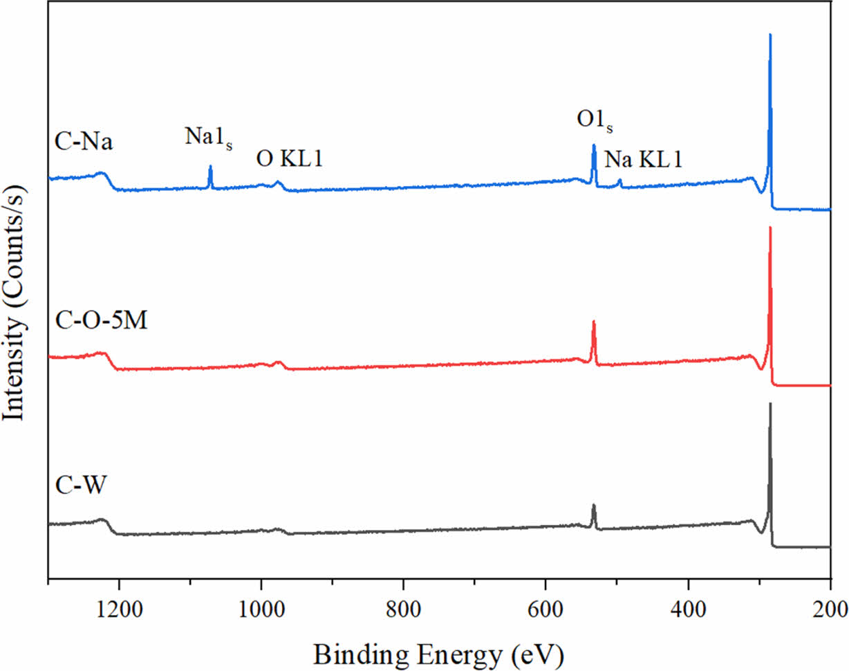 The EDS results in Table 2 indicated that more oxygen functional groups were attached to the surface after oxidization using HNO3. Treatment with NaOH produced sodium atoms on the surface of the oxidized activated carbon. The atomic ratio and functional groups were con- firmed in the XPS results of Fig. 3. The functional groups of C-C/C-H (284.78 eV), C-O(H) (285.98 eV), C=O (287.08 eV), and O-C=O (288.68 eV) were identified. These corre- sponded to phenolic (C-O(H)), carbonyl (C=O), and carboxyl (O-C=O) groups, respectively (Guo et al., 2018). Additionally, Na1s and NaKL1 peaks were identified at 1071.88 eV and 502.08 eV, respectively, confirming a new Na-O bond.
