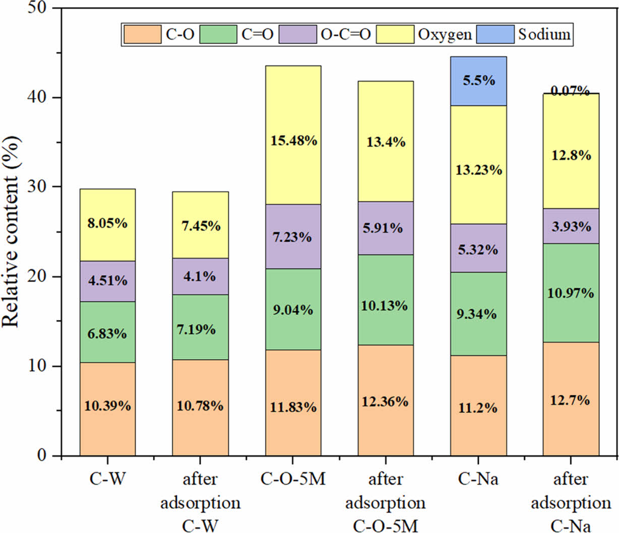 The higher the adsorbed concentration onto the surface-modified activated carbon was, the lower was the zeta potential value. Among the activated carbons, C-Na had the lowest zeta potential and C-W had the highest. The surface-modified activated carbon had a lower zeta potential compared to that of activated carbon due to the carboxyl groups and sodium in the surface-modified activated carbon. The XPS results (Fig. 4) also suggested that the surface-modified activated carbon had more oxygen functional groups compared to that of pure activated carbon. Due to electrostatic interactions between positively charged heavy metals and the negatively charged surface of the activated carbon, the heavy metal adsorption increased in surface-modified activated carbon. Fig. 4 showed the ratio of func- tional groups and oxygen present in the modified activated carbon before and after the adsorption of heavy metals. Before modification, the ratio of oxygen atoms in activated carbon was 8.05%. After oxidizing the surface and modifi- cation with sodium, the proportion of oxygen atoms increased to 15.48% and 13.23%, respectively. Accordingly, the overall proportion of oxygen functional groups also increased. After the adsorption of heavy metals, the ratio of oxygen atoms decreased to 7.45, 15, and 12.8% in C-W, C-O, and C-Na, respectively. The carboxyl groups decreased after heavy metal adsorption, but the ratio of carbonyl groups to hydroxyl groups was increased. These results showed that the main mechanism of heavy metal adsorption was that the ion exchange between H+ of the carboxyl group and the heavy metals.