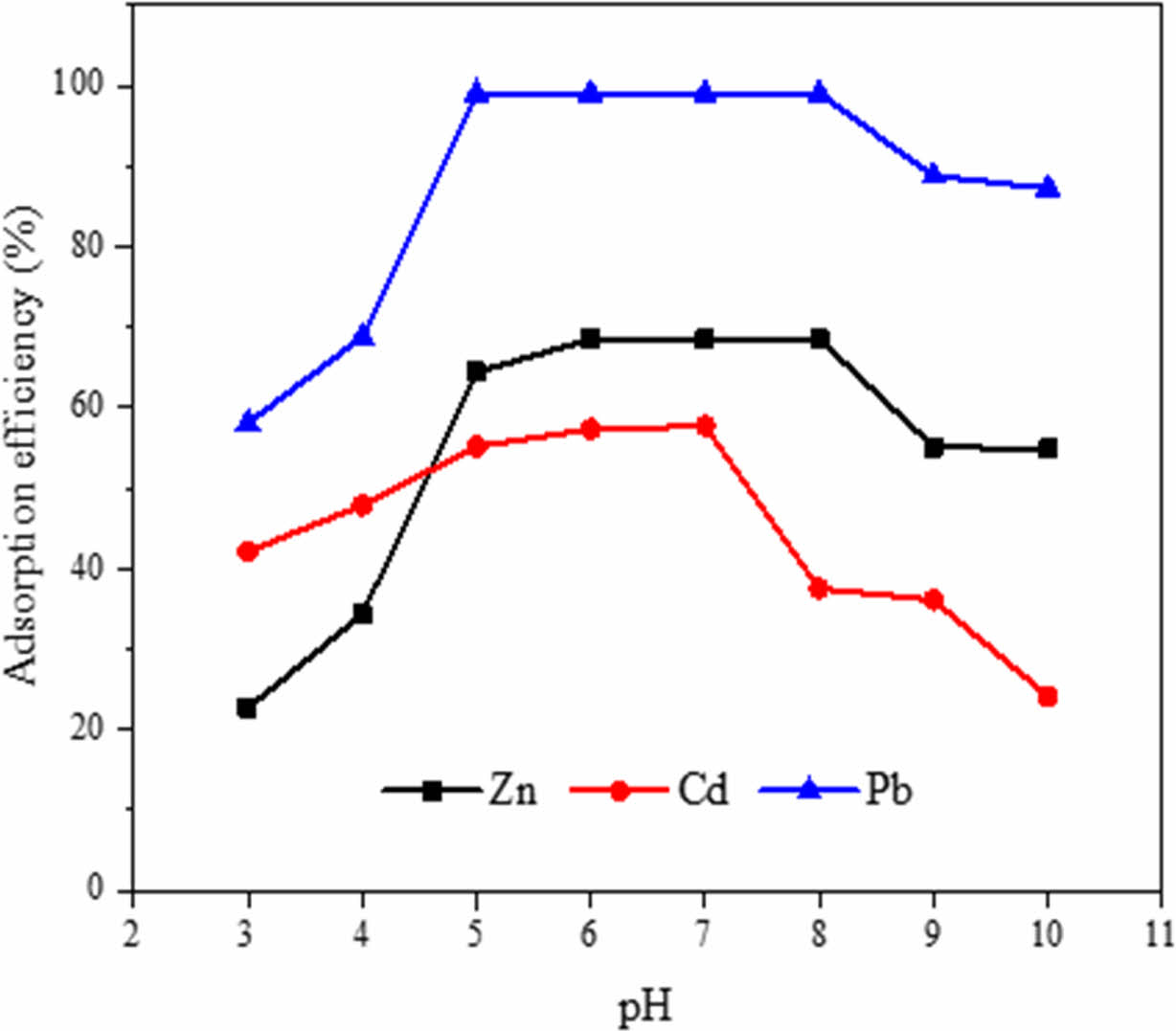 Heavy metals exhibit different speciation depending on pH changes at alkali pH conditions. Cd(OH)2 is a dominant species under alkali conditions greater than pH 8.8 (Lee et al., 2012). Similarly, Cd, Pb(OH)2, and Zn(OH)2 are domi- nant species at pHs higher than pH 9.4 (Cruz-Lopes et al., 2021). The decrease in adsorption of heavy metals under alkali conditions resulted from the formation of heavy metal precipitations, which interfered with adsorption and ion exchange on the surface of activated carbon. The most appropriate pH conditions for heavy metal adsorption was between pH 5 and 8 in surface modified activated carbon.