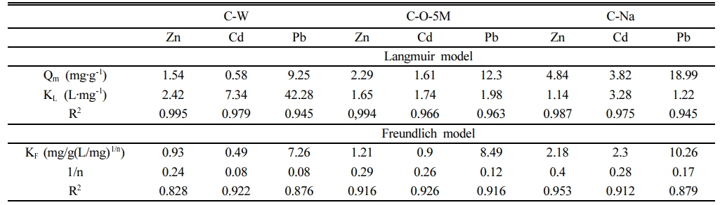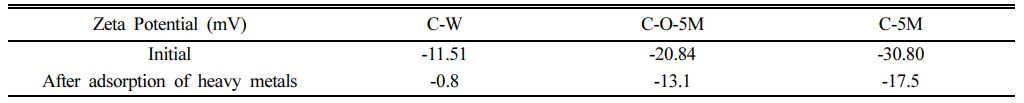 For C-Na, the maximum adsorption capacity estimated with the Langmuir isotherm model was the highest at 4.84, 3.82, and 18.99 mg∙g-1 for Zn, Cd, and Pb, respectively. The KF of the Freundlich model was also the highest for Zn, Cd, and Pb at 2.18, 2.3, and 10.26 mg∙g-1, respectively, indi- cating that C-Na had the higher adsorption capacity for heavy metals than C-O-5M and C-W (Table 3). Based on the zeta-potential measurements before and after heavy metal adsorption, the adsorption of heavy metals on surface modified activated carbons could be explained (Table 4).