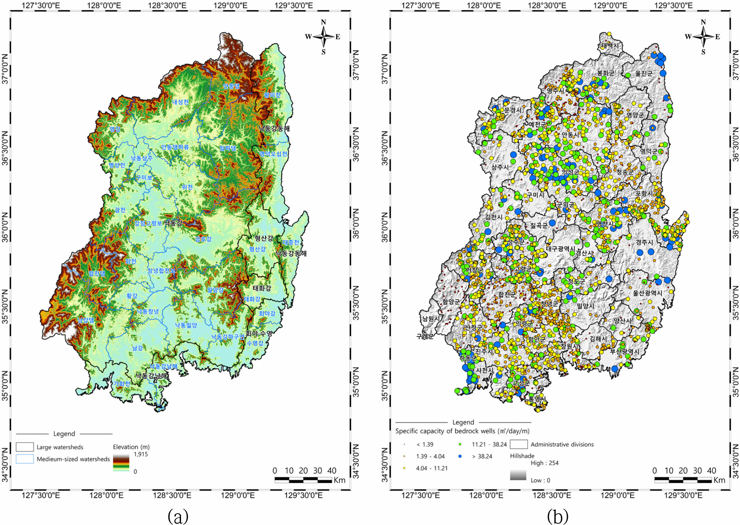 Fig. 1 Study area: (a) Large watersheds and medium-sized watersheds on the topographic map in the Nakdonggang River Basin. (b) The distribution of specific capacity (m3 /day/m) in bedrock wells on the shaded relief map (n=2014). The specific capacity data were logtransformed and then classified using the Jenks natural breaks. |