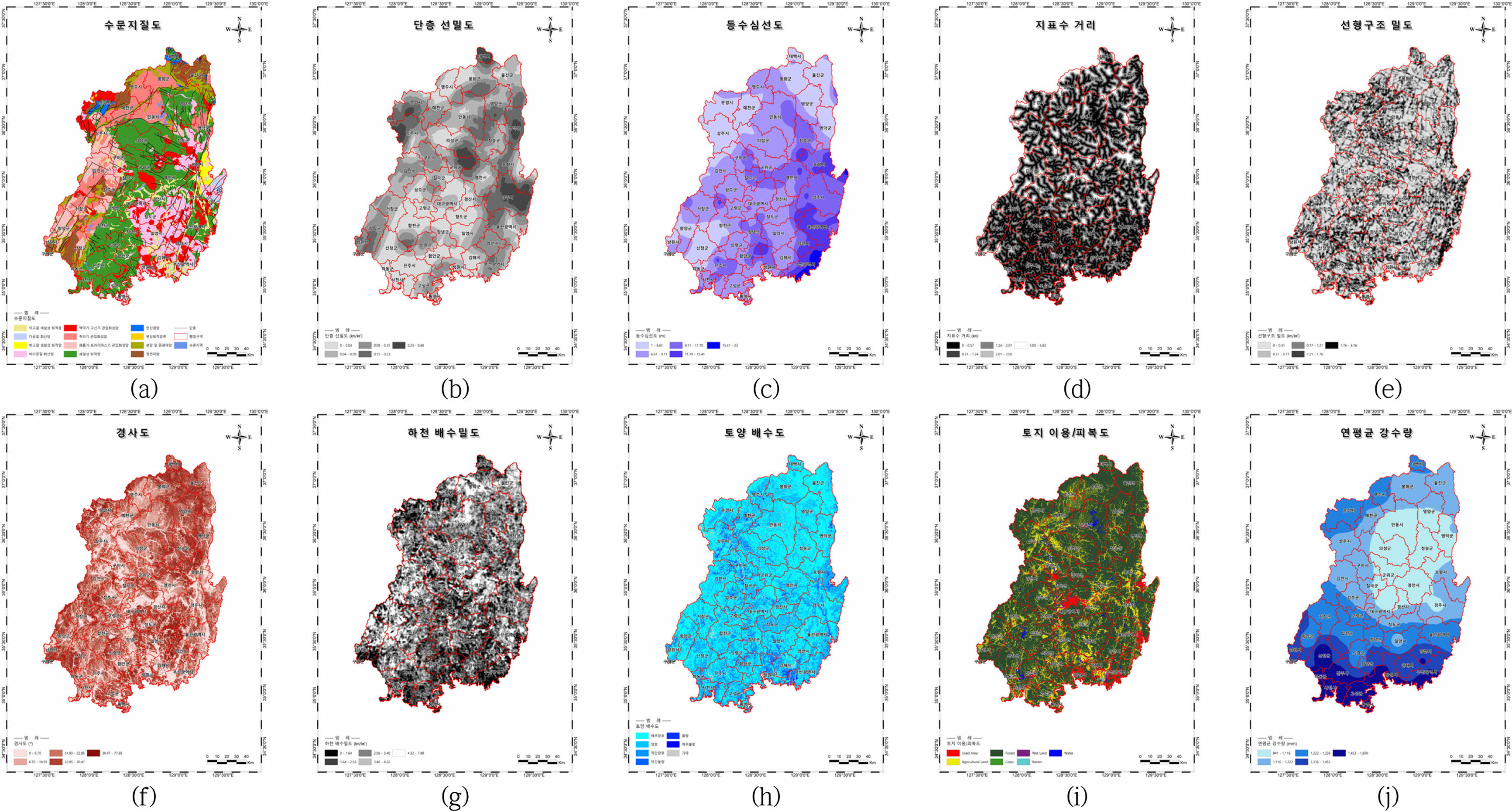 낙동강권역의 GPM 평가를 위해 총 10개의 변수를 선정하고, 상용소프트웨어인 ArcGIS Pro 3.1.0을 사용하여 주제도를 구축하였다(Fig. 2). Díaz-Alcaide and Martínez- Santos(2019)에 의해 GPM 평가에 있어 가장 빈도 높게 활용되는 것으로 확인된 8개의 변수(지질, 선구조, 지형, 토양, 토지이용도, 강우, 배수밀도, 경사도)가 모두 고려된 것을 알 수 있다. 주제도의 격자 크기는 30 m × 30 m로 통일하였으며, 점(point) 정보(등수심, 연평균 강수량)는 역거리가중법(Inverse Distance Weighting, IDW)으로 보간하였다. 연속형 자료의 경우(Figs. 2b, 2c, 2d, 2e, 2f, 2g, 2j), Jenks natural breaks를 이용하여 등급을 구분하였다. Jenks natural breaks는 등급 내 분산은 줄이고, 등급 간 분산은 최대화하는 방법으로 등급을 구분한다.