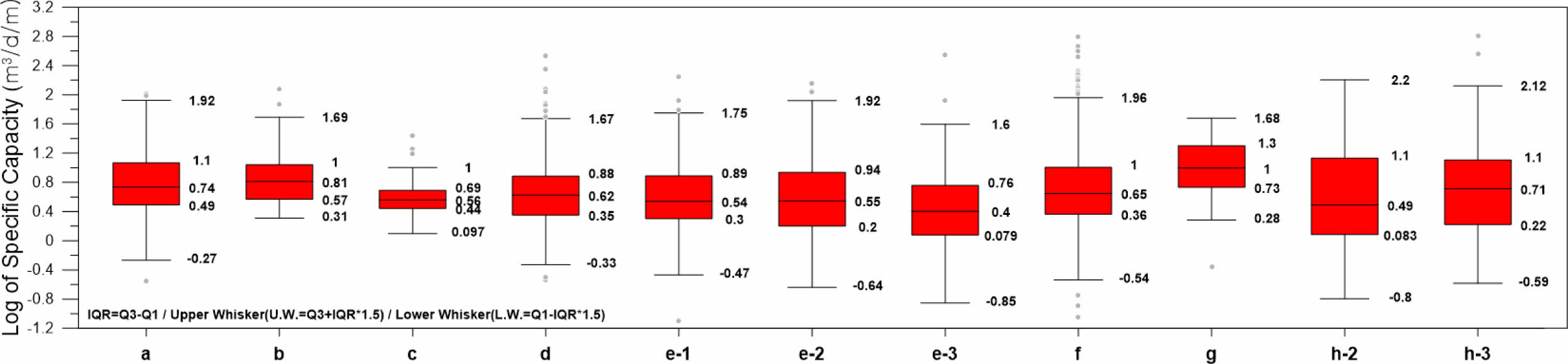 Fig. 3 Box plot of specific capacity (m3 /day/m) in bedrock aquifers (on a logarithmic scale) depending on hydrogeological units: a. Unconsolidated clastic sediments (n=154), b. Porous volcanic rocks (n=31), c. Semi-consolidated clastic sedimentary rocks (n=36), d. Non-porous volcanic rocks (n=170), e-1. Cretaceous-Paleogene intrusive igneous rocks (n=174), e-2. Jurassic intrusive igneous rocks (n=344), e-3. Permian-Triassic intrusive igneous rocks (n=100), f. Clastic sedimentary rocks (n=787), g. Carbonate rocks (n=26), h-2. Schists & Paragneisses (n=75), h-3. Orthogneisses (n=111). |
