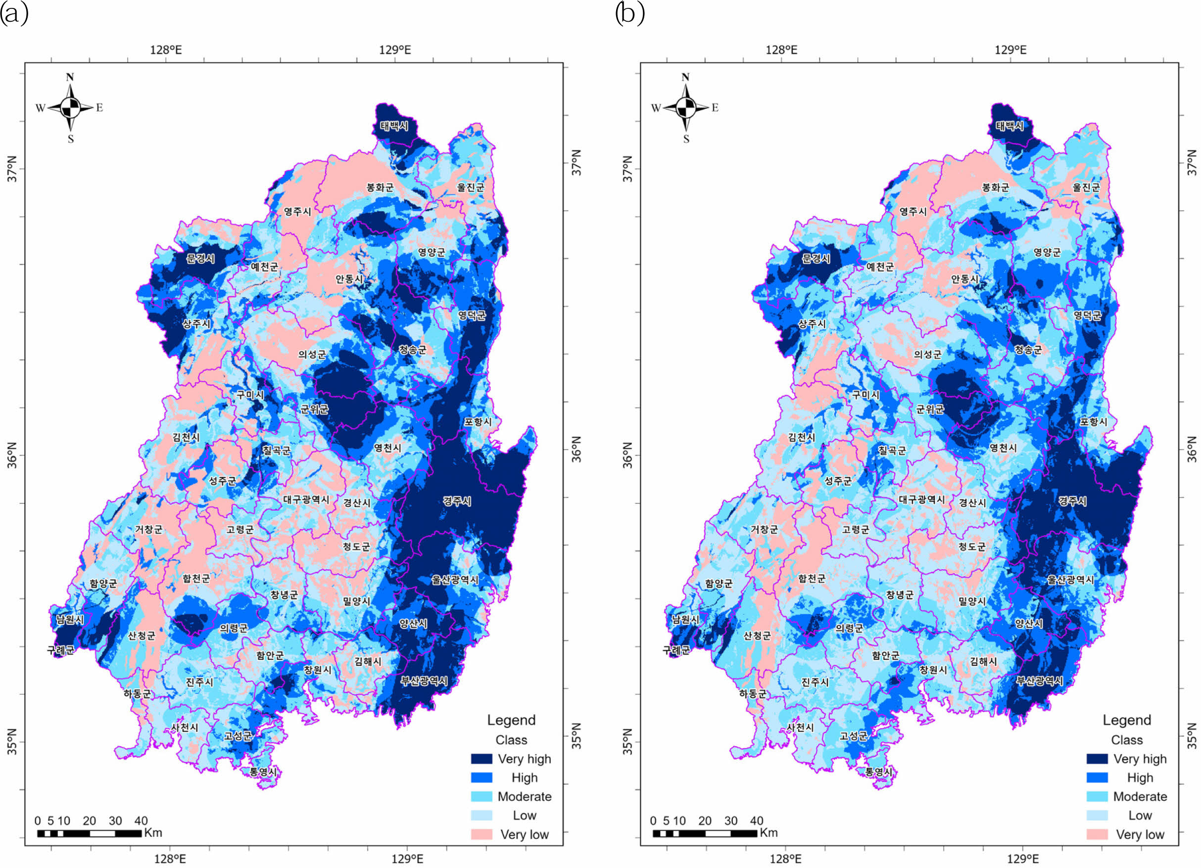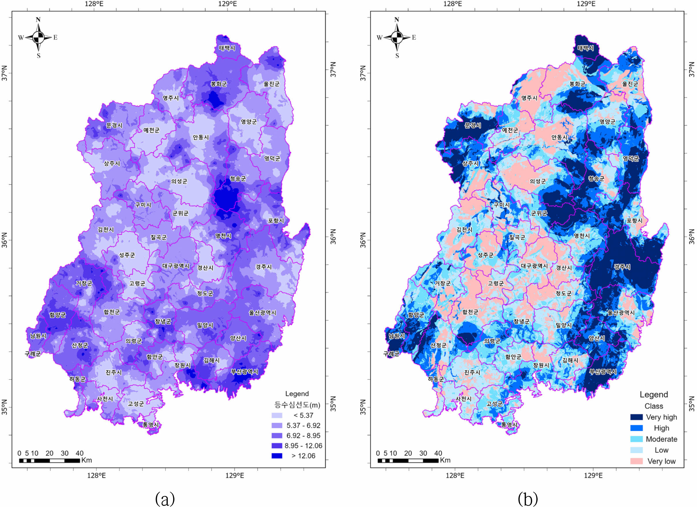 평가 방법의 특성 차이로 인해 Fig. 4a의 산출 등급에는 단층 선밀도가 큰 영향을 미쳤으나, Fig. 8a에서는 미비한 영향을 미쳤다(Table 6의 낮은 FRjk). 반면 Fig. 8a에서는 경사도와 토지이용/피복도가 큰 영향을 미쳤는데, 이와 같은 차이로 인해 Fig. 4a와 Fig. 8a의 GPM이 서로 다른 분포 특성을 보이고 있다. 동일한 주제도를 사용했음에도 불구하고 평가 방법에 따라 결과가 달라질 수 있다는 것을 보여준다.