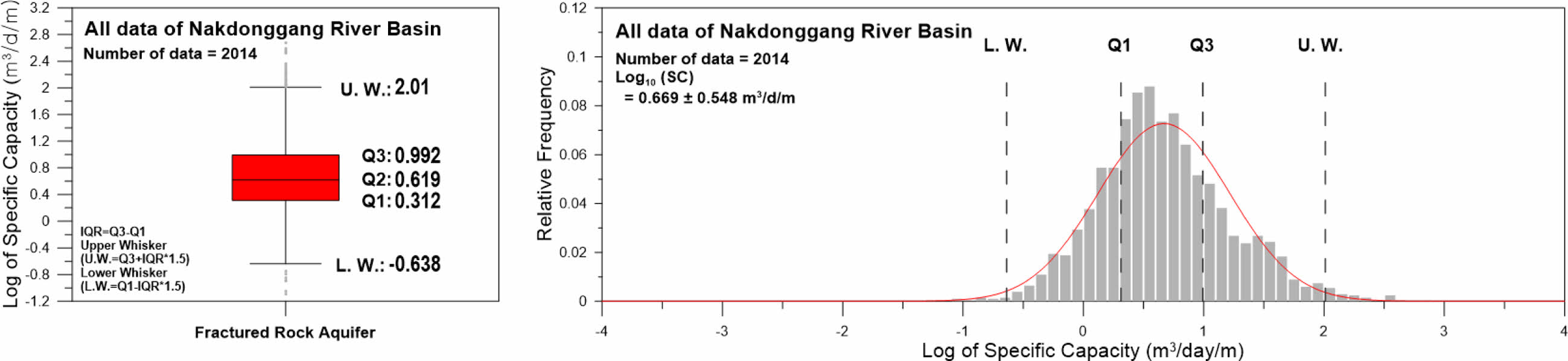 Fig. 5 Box plot (left) and relative frequency distribution (right) of specific capacity (on a logarithmic scale) in bedrock aquifers on the the Nakdonggang River Basin (n=2014). |