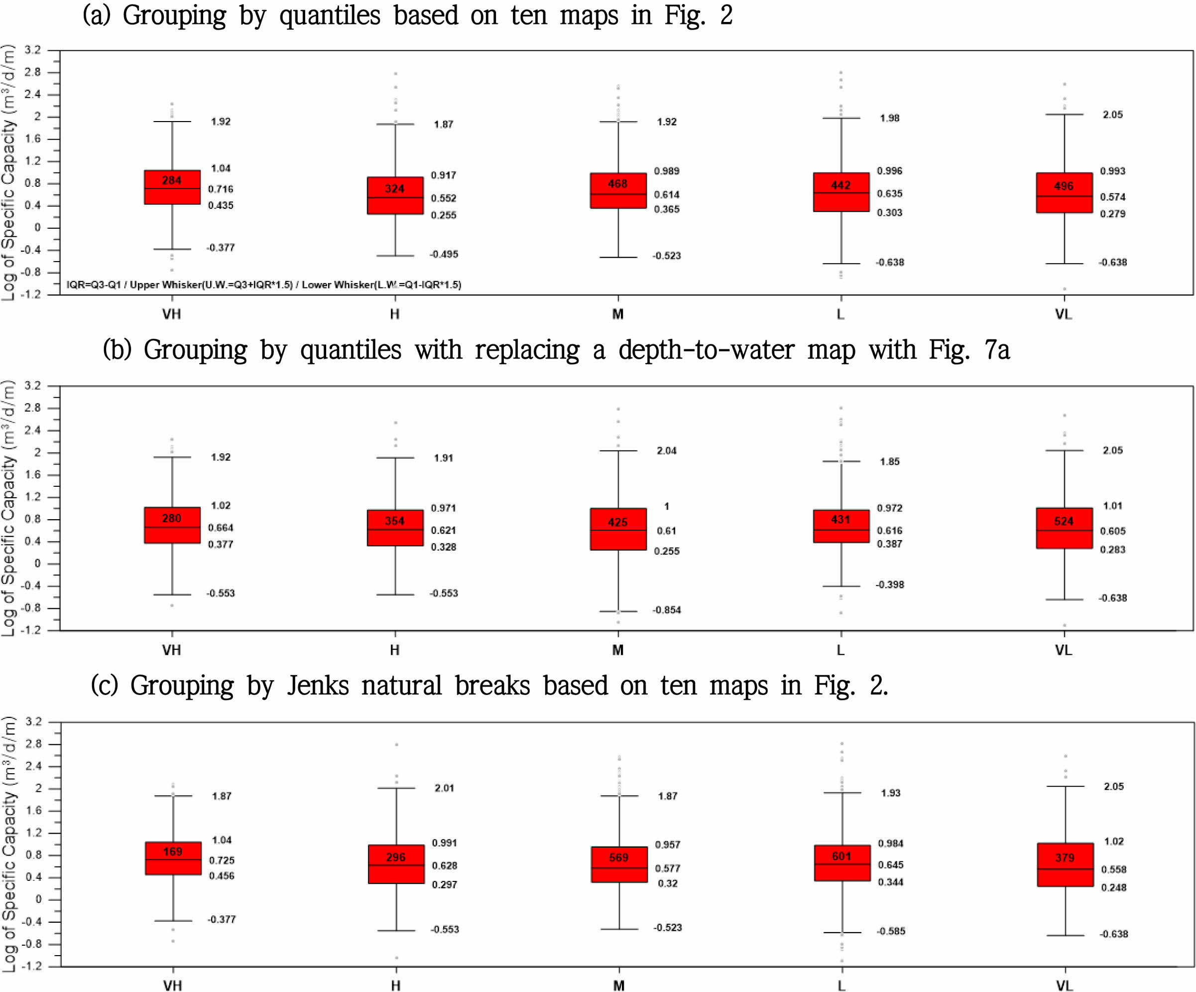 Fig. 6 Box plot of specific capacity (m3 /day/m) (on a logarithmic scale) for each potential level (VH: Very high, H: High, M: Moderate, L: Low, VL: Very low). The values within the box indicate the number of specific capacity data for the box plot. |